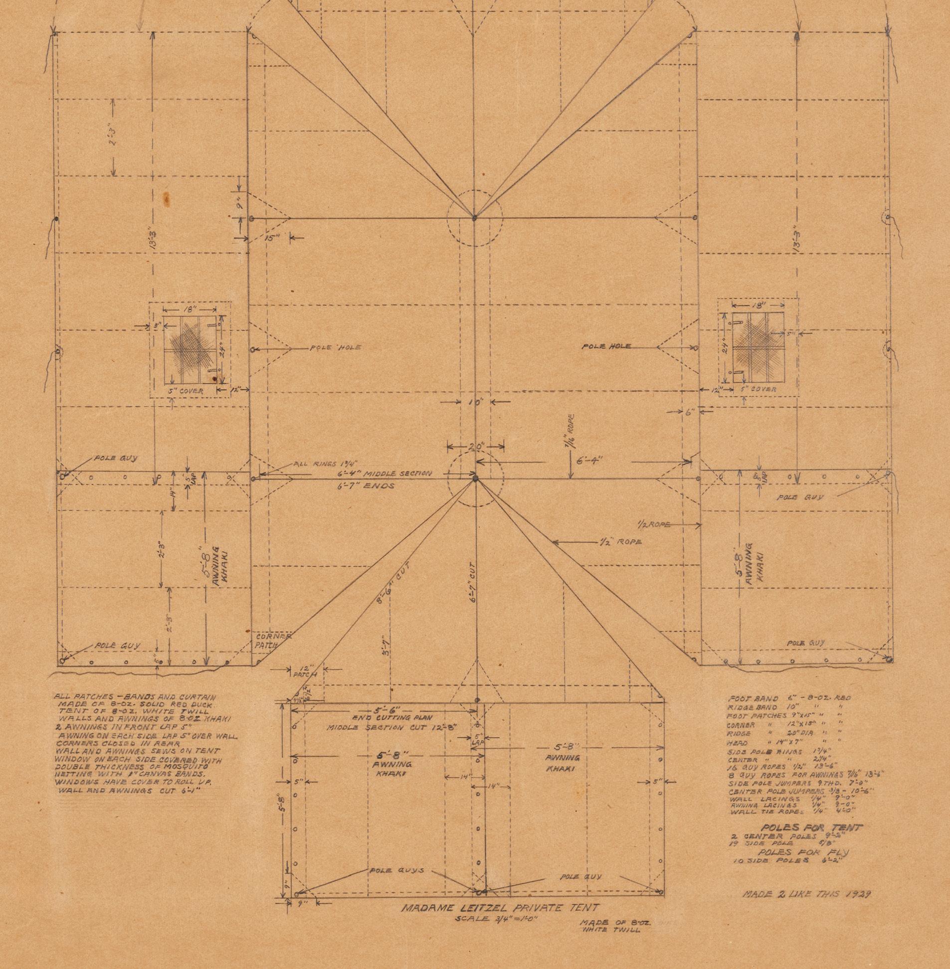 A prime example is the structural system: large tents relied on an intricate network of ropes that created tension when erected, securing and supporting the canvas. Hobson’s journals devote considerable space to documenting the amount, placement, size, and type of rope sewn into the canvas to form this structural network. While Howard wasn’t constrained by these structural requirements at model scale, he still chose to represent this system through careful appliqué on the model tent’s fabric surface, indicating where these ropes would be positioned in the full-scale tent.”