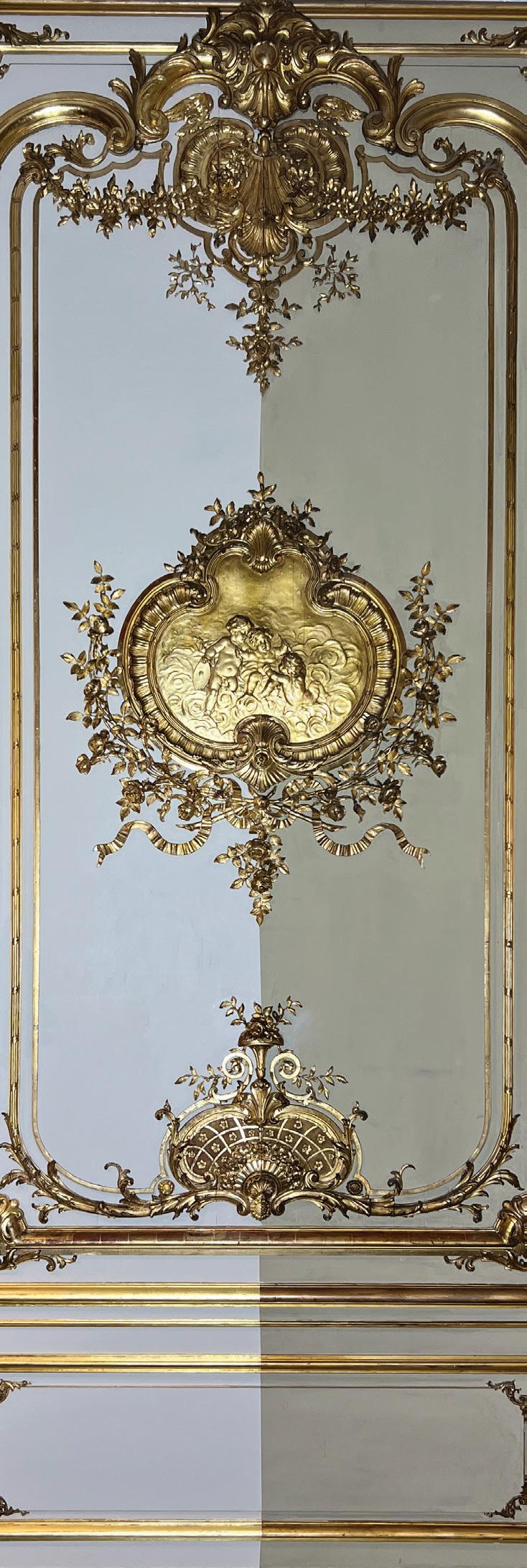 The treatment involved reattaching areas of lifting gilded gesso to prevent further loss. Damaged carved wood elements were stabilized and repaired. Surface grime layers were removed and disfiguring, non-original coatings on the gilded decoration were reduced where possible—exposing the exquisite gilded surfaces below. Ingilding (applying gold leaf to areas of loss) or limited overgilding (applying gold leaf to gilded areas that had disfiguring, non-removable coatings) was carried out. As it was not feasible to uncover the original paint layers on the large fields of boiserie background, the color was matched and the panel was repainted.