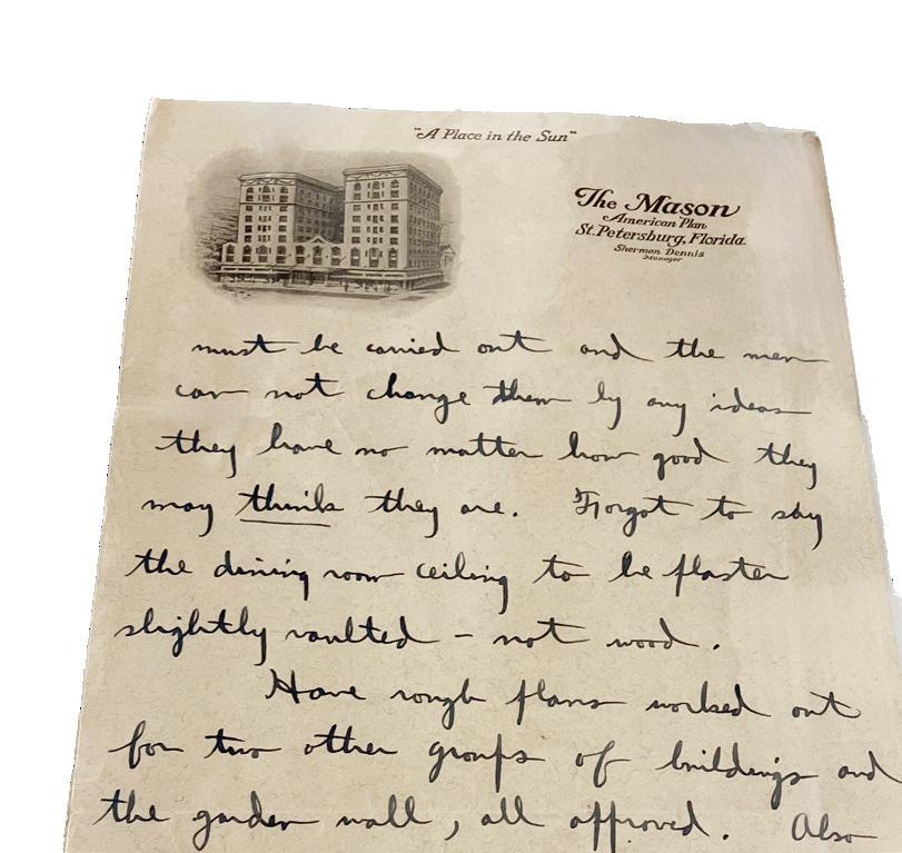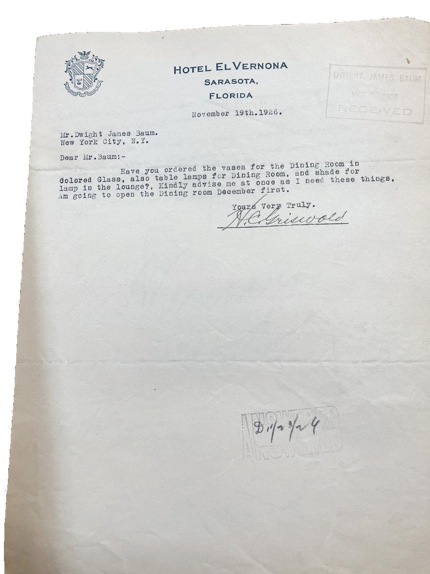 The Baum business records mark a watershed moment in the history of Ca’ d’Zan and signify a new chapter of scholarly study focusing on primary source materials. This collection reveals more information about Ca’ d’Zan than has ever been available in the institution’s history. The documents hold great potential for curatorial research, opening avenues for investigation into the sources of functional and decorative features throughout the mansion. The correspondence also sheds light on a multitude of factors that went into decision making for a variety of details spanning from design to construction. For instance, the construction superintendent’s letters and telegrams are particularly telling in terms of the logistical challenges of building a mansion in Sarasota in the 1920s. The Baum records not only give the Museum the ability