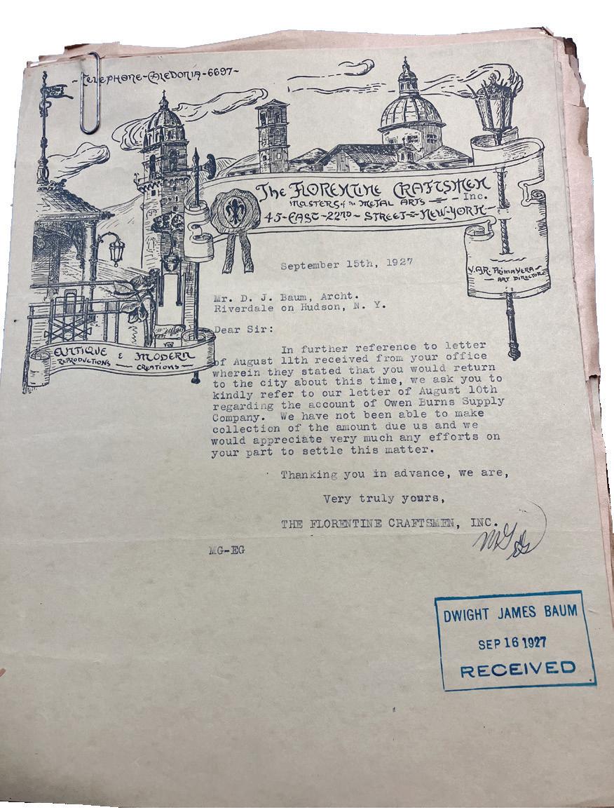 When I received a phone call out of the blue three years ago, I was surprised to learn about the discovery of business records of Ca’ d’Zan’s architect, Dwight James Baum. The papers had been hidden away in a quaint Tudor Revivalstyle house in The Bronx for decades, unbeknownst to the homeowners until they recently undertook a renovation. The residence originally served as the office for Baum’s architectural firm in the neighborhood where he lived and worked amongst dozens of homes he designed. Long-thought to be lost, the records consist primarily of correspondence that traces the progression of construction of John and Mable Ringling’s winter residence, Ca’ d’Zan, from 1924 to 1926.