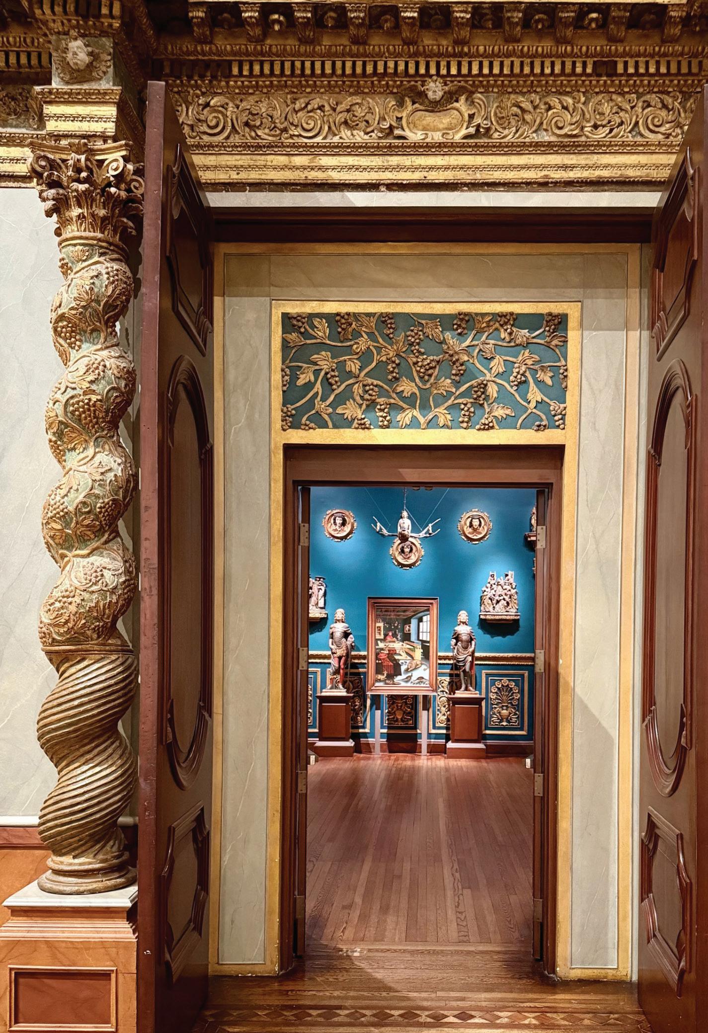 The lavishly-decorated interior of the Astor Cream Salon in Gallery 19 of the Museum of Art is known as boiserie—that is, wood-paneled walls with ornately carved, painted, and gilded decoration, originating from or in the style of 17th- and 18th-century France. This paneling was fabricated circa 1896 by Jules Allard et Fils, a leading interior designer of the Gilded Age. The room was originally installed in the palatial Astor Mansion on Fifth Avenue in New York City for Caroline Schermerhorn Astor (1830–1908). In 1926, when the mansion’s contents were sold prior to demolition of the home, John Ringling purchased the boiserie of this room—and the adjoining Astor Library—for installation in the Museum of Art.
