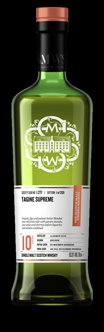 The initial nose was dominated by bakery notes, from well-fired rolls and treacle scones to sugar buns. We also got heather honey, peach melba and new cask staves. The attractive and inviting palate had us smacking our lips to the sweet flavours of dark chocolate coconut bars, digestive biscuits, rice pudding and chocolatecoated brazils; the finish was a warming flourish of black pepper, chilli and cardamom. The reduced nose encountered iced caramels, marshmallows and sugared almonds, perfumed candles and pine sawdust. The palate now combined waxy honeycomb and iced gingerbread with liquorice, linseed oil, paprika and oak.