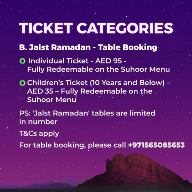 Jalst Ramadan ticket AED 95 for adults and AED 35 for kids 10 years and below. Tickets fully redeemable on Suhoor menu.