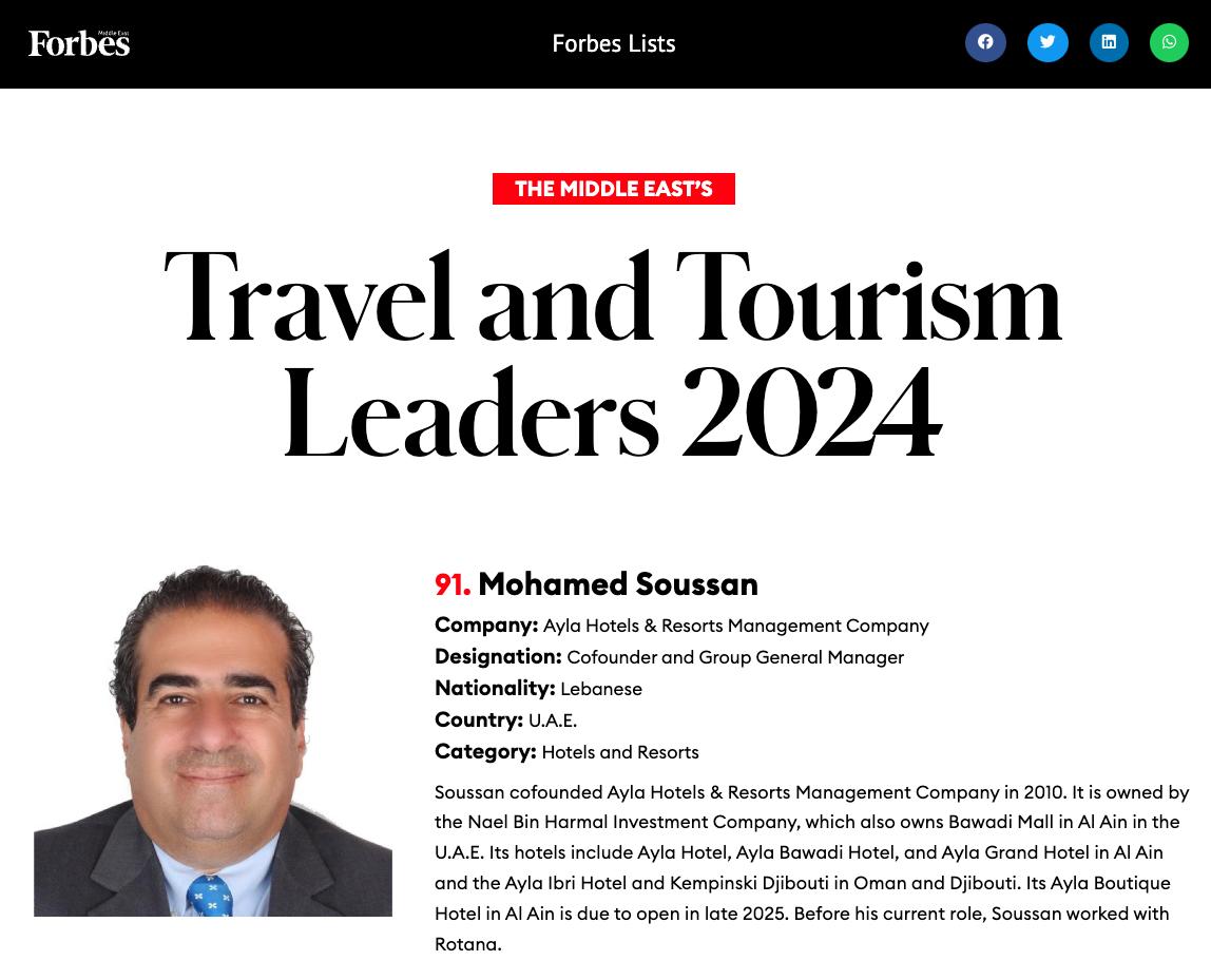 Mohammed Soussan, General Manager of the Ayla Hotel Group, once again received well deserved recognition, ranking on the Forbes list of top 100 Travel and Tourism leaders 2024. The list boasts other travel industry icons like Ahmed bin Saeed Al Maktoum - Emirates Airline & Group, Mohamed Abdalla Al Zaabi - Miral, and Raki Phillips - Ras Al Khaimah Tourism Development Authority (RAKTDA) to name a few.