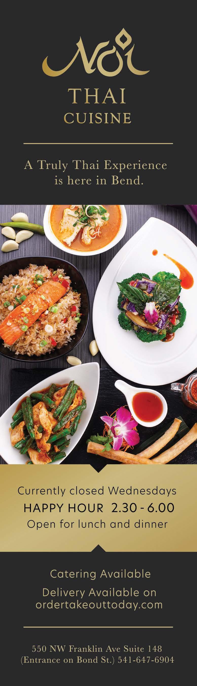 4 RESTAURANT GUIDE 2023 » VISIT OUR CHARMING PATIO OR COZY UP IN OUR EXPANDED DINING ROOM. » ENJOY A GROWING MENU OF SANDWICHES, LIGHT FARE, AND DELIGHTFUL HOUSE BAKED PASTRIES, TRADITIONAL, VEGAN AND GF FRIENDLY. » OPEN 7 DAYS A WEEK 50 SE SCOTT STREET CAFEDESCHUTES.COM » A European Inspired Café offering more than simply excellent coffee! « Untitled-1 2 5/9/23 7:01 PM PizzaMondoBend.com (541) 330-9093 811 NW Wall St. PIZZA PERFECTION By the Slice or the Whole Pie VOTED Best Pizza 25 Years & Running! at the Redmond Farmers Market SATURDAYS at the Downtown Bend Artisans Market & More Locations Coming Soon! zorbathegreektruck.com @_zorbathegreek_ zorbathegreektruck@outlook.com ZORBA THE GREEK theaterbend.com SAVE 20%-50% on your favorite local businesses Purchase discount gift certificates online at perks.bendsource.com