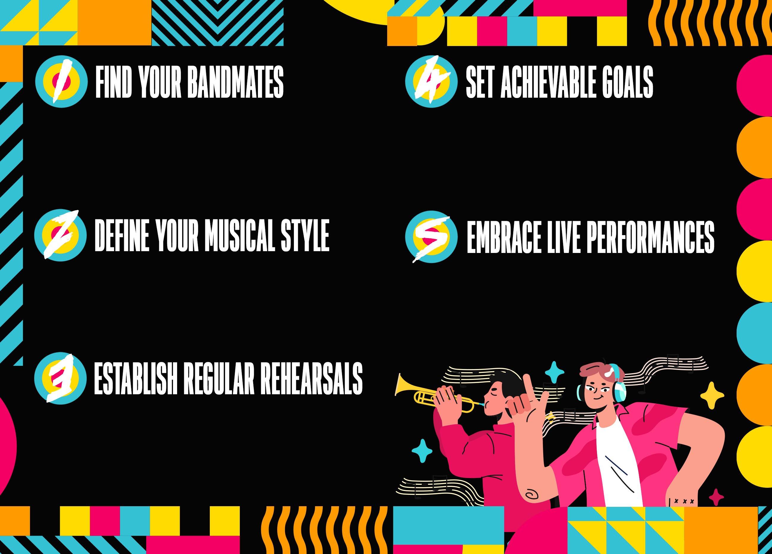 Consistency is key when starting a band. Establish a regular rehearsal schedule that works for all band members. Dedicate speci c days and times each week to practice together. Treat rehearsals as a sacred time for collaboration, experimentation, and improvement. Encourage everyone to come prepared, having practised individually beforehand. Regular rehearsals not only re ne your skills as a unit but also foster a strong bond among bandmates.