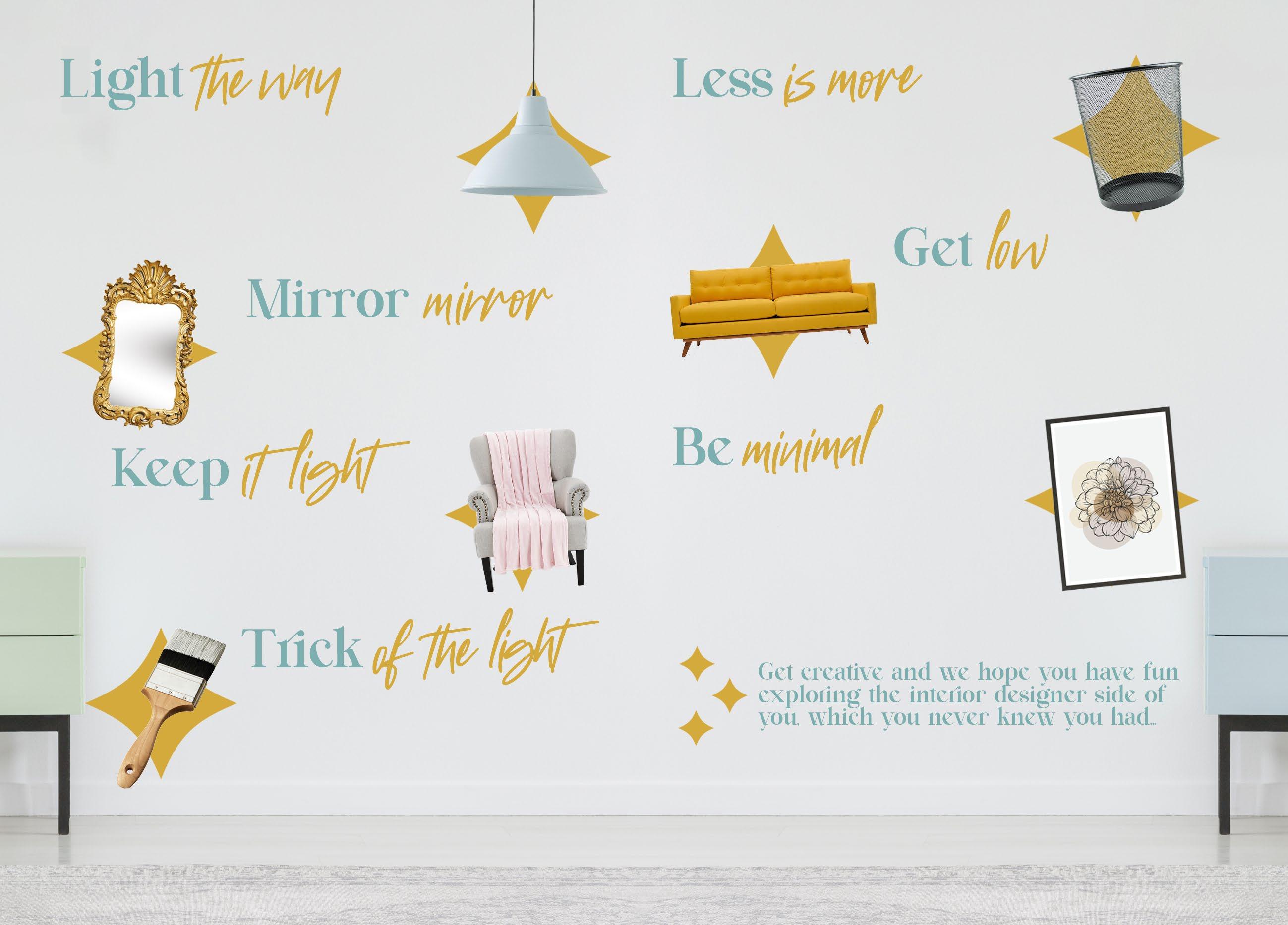 Place mirrors near lights and windows to re ect and bounce that brightness around, avoiding areas where there is clutter, and not above your bed!
