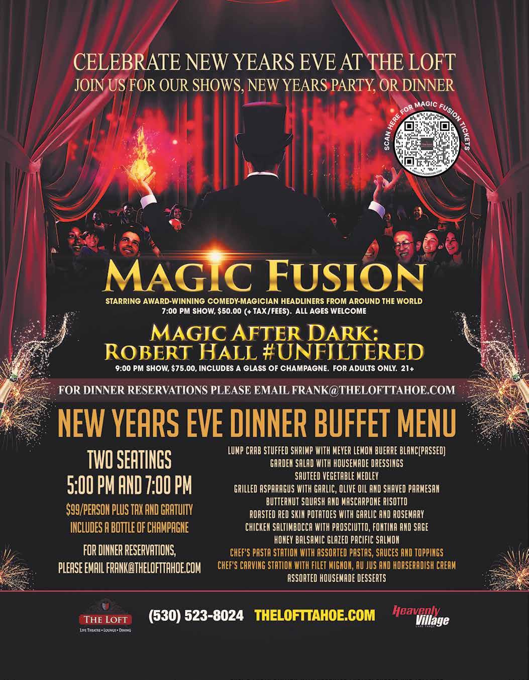 Dec. 31 | The Loft | South Lake Tahoe Ring in 2023 with live entertainment, delectable cuisine, mesmerizing magic and dancing. Guests can watch 2022 vanish and 2023 appear with several New Year’s Eve celebration packages to choose from. | thelofttahoe.com