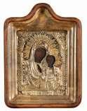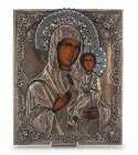 rafigurante Vergine col Bambino. Riproduzione su tavola con riza in metallo argentato con smalti policromi. Misure cm. 31 x 26.