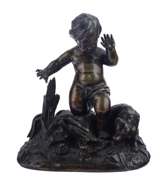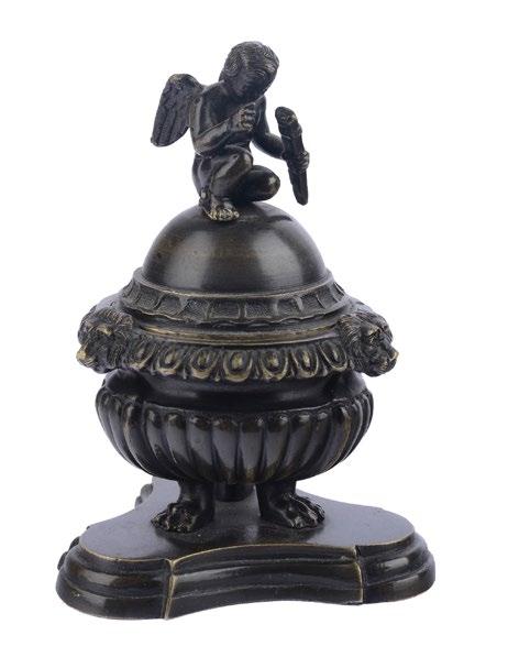 in bronzo, poggiante su base trilobata con profili sagomati, corpo con decori a baccellature e teste di leone, il coperchio è sormontato da una figura di putto alato, XIX sec., cm. 12x8,5x8,5