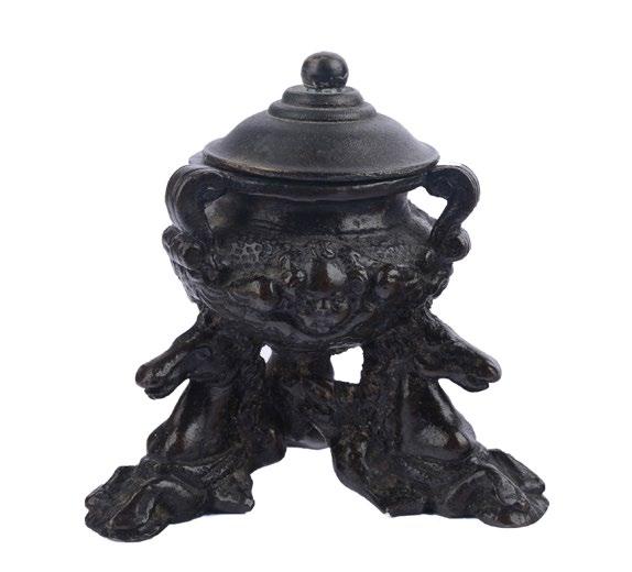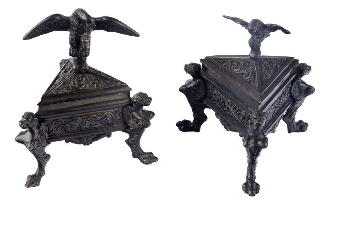 in bronzo a base triangolare, decorato da figure antropomorfe sugli angoli e racemi vegetali incisi, sul coperchio un aquila a tutto tondo, XIX sec. cm. 17x14x11,5