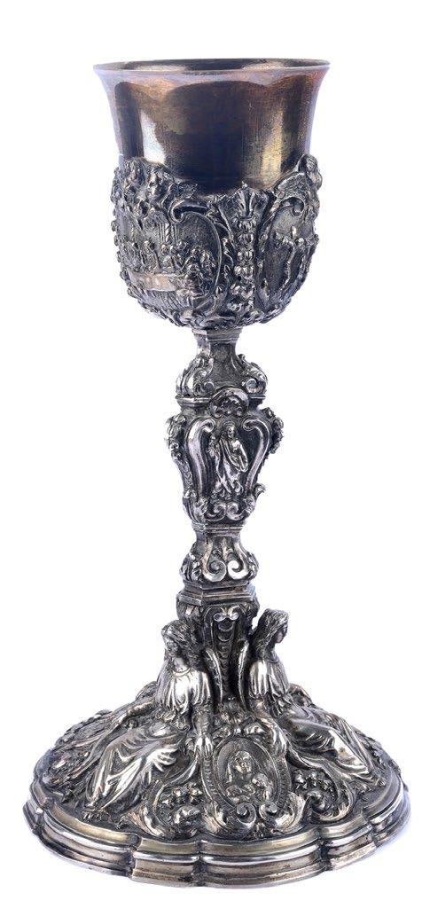 in argento sbalzato e cesellato, base circolare sagomata con figure di angeli intervallate da medaglioni; sottocoppa con rilievi raffiguranti scene della vita di Cristo entro riserve, (apparentemente privo di punzonatura), fine XVIII, inizi XIX sec., cm. 30