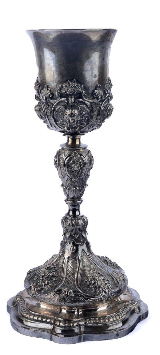 in argento, base circolare sagomata e gradinata, decorato da fiori sul fusto, nel sottocoppa teste di cherubini, punzoni dello Stato Pontificio e dell’argentiere “P122”, Bologna, XIX sec., cm. 29