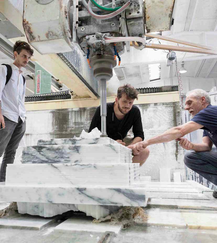 Nairy Baghramian al lavoro con le maestranze Henraux