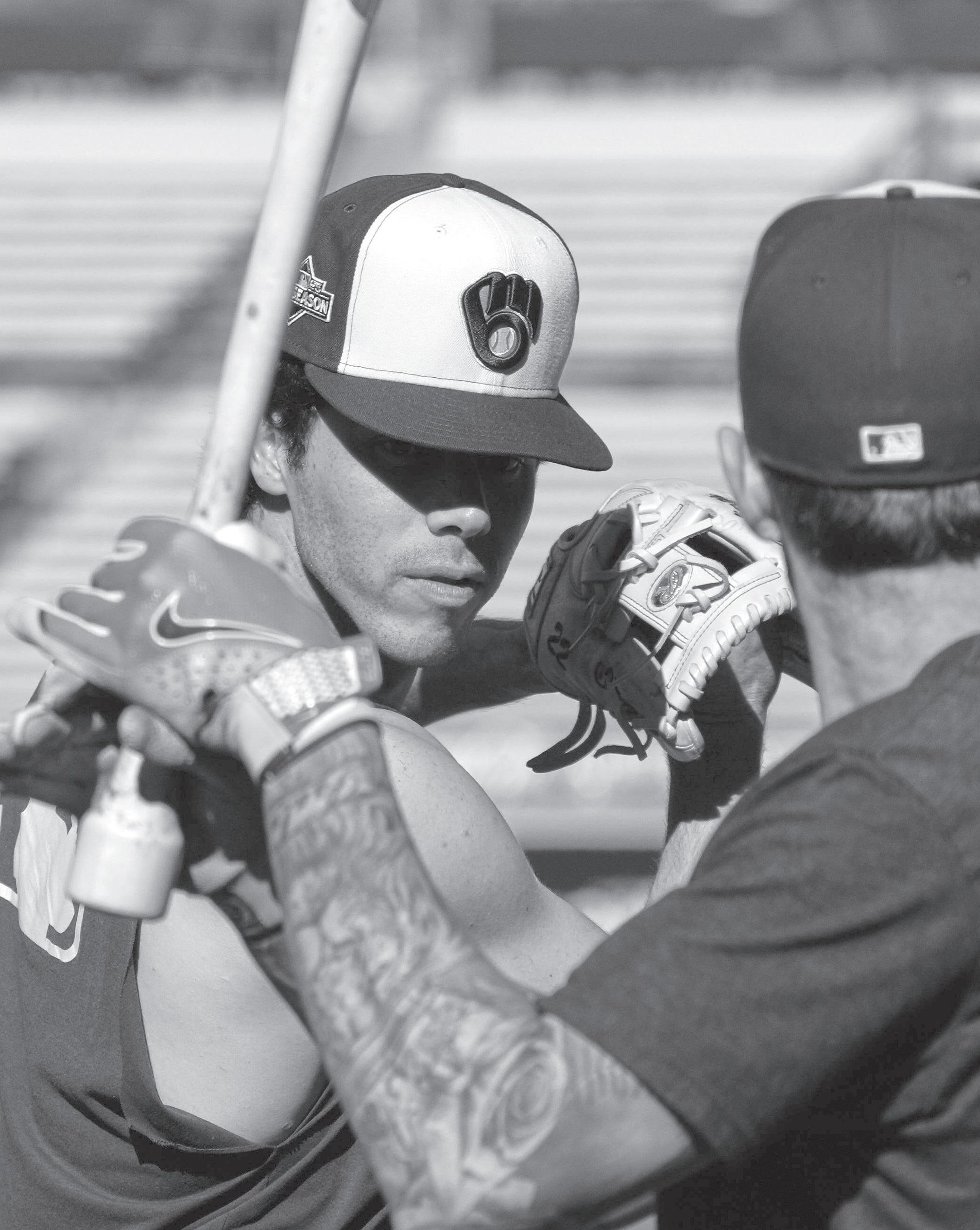 MILWAUKEE Brewers’ Christian Yelich, left, and Brice Turang warm up during practice yesterday.