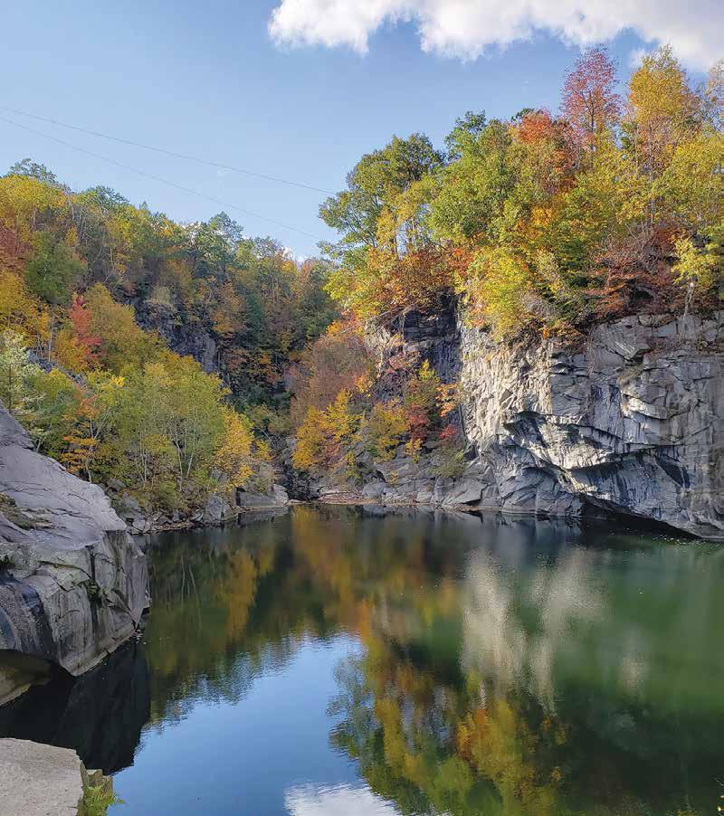 Once improvements to the access road are complete (expected by late fall; updates can be found at thetrustees.org/ becketquarry) Cruey recommends visitors trek around the old quarry site, then take side excursions on the smaller routes through the conservation areas. At the highest elevations, the vistas stretch out to the Pioneer Valley and Mount Greylock. “There are seven miles of trails here, which is quite extensive for a site of this size, so give yourself some time to explore,” he says. And around every corner, these 280 acres bear the patina of the past.