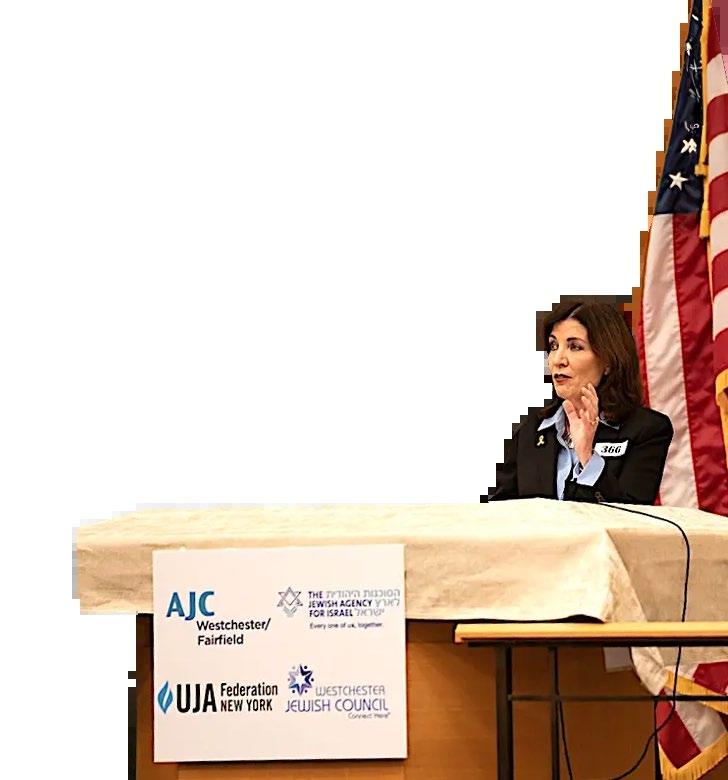 New York Gov. Kathy Hochul was among the state and local officials attending an event on the night of Oct. 6 at Temple Israel Center in White Plains that marked the first anniversary of the Oct. 7 attack on Israel by Hamas. Hochul was accompanied at the event by her husband.