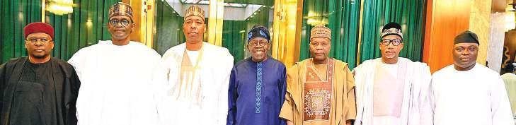L-R: Adamawa State Governor, Alhaji Ahmadu Umoru Fintiri; Yobe State Governor, Alhaji Mai Mala Buni; Borno State Governor, Prof. Babagana Umara Zulum; President Bola Ahmed Tinubu; Gombe State Governor, Alhaji Inuwa Yahaya; Bauchi State Governor, Alhaji Bala Mohammed; and Taraba State Governor, Agbu Kefas, during the President’s meeting with the North East Governors Forum, at the Presidential Villa, Abuja, yesterday PHOTO: GODWIN OMOIGUI