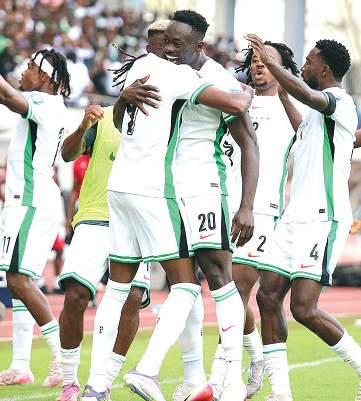 Super Eagles players mobbed Victor Osimhen in celebration shortly after the Galatasaray forward scored the hat trick in Nigeria’s 4-0 defeat of Benin Republic in Uyo... yesterday