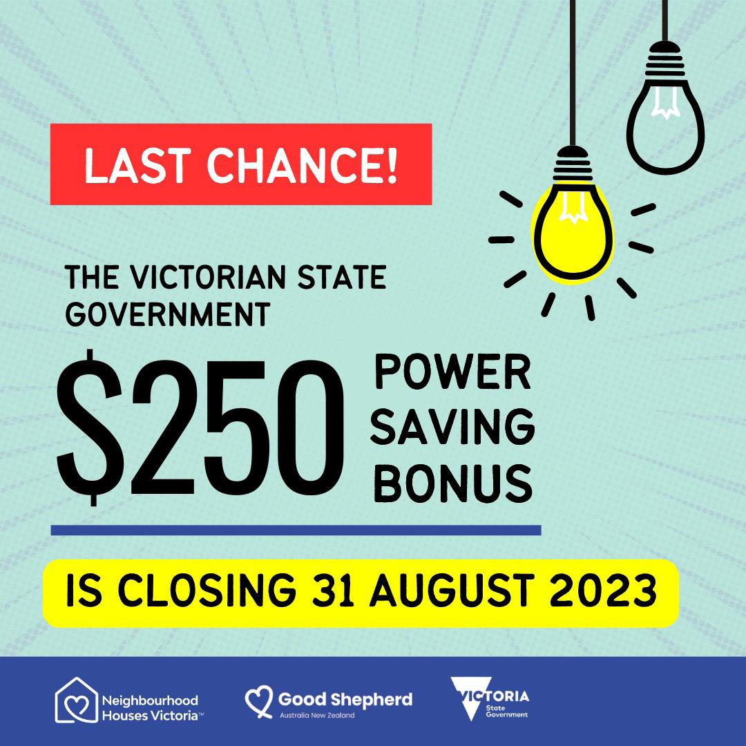 Every Victorian household including rental properties are eligible to claim for the $250 Power Saving Bonus. The current round started on 24 March, 2023 and is due to finish Thursday, 31 August, 2023. All you need to do is bring a current or recent electricity bill into the Neighbourhood Centre between 10:00am and 3:00pm along with your bank account details (BSB and Account Number). For every claim made through us at the Neighbourhood Centre we receive $10 from Neighbourhood Houses Victoria. If you have any queries call the Centre on (03) 5754 1166.
