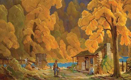 Rudolph Ingerle, a Chicago-area artist originally from Vienna, Austria, was also drawn to the Southern Appalachian landscape and became known as “the Painter of the Smokies.” He painted en plein air and lured other plein air artists to the region, thereby contributing to the establishment of Great Smoky Mountains National Park in 1934. Ingerle’s luminous, colorful landscape Sunday Afternoon (1929) preserves a moment in the history of the region with its stylized rendition of a small mountain homestead.