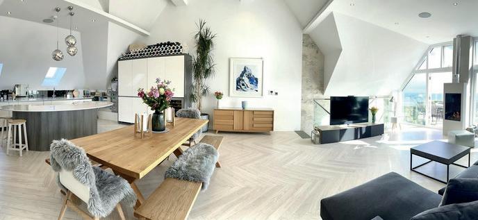 Experience luxury in this exquisite 4 bedroom, 4 bathroom duplex penthouse including breathtaking views of Portelet Bay. Featuring a modern kitchen, spacious open-plan living and dining area with sliding patio doors to a westerly terrace & south-facing balcony. An owners’ suite with a walk-in wardrobe and private balcony, along with 3 additional bedrooms. Externally 3 secure garage parking spaces, an electric car charging point, lift access to all floors, and the comforts of air cooling and heating.