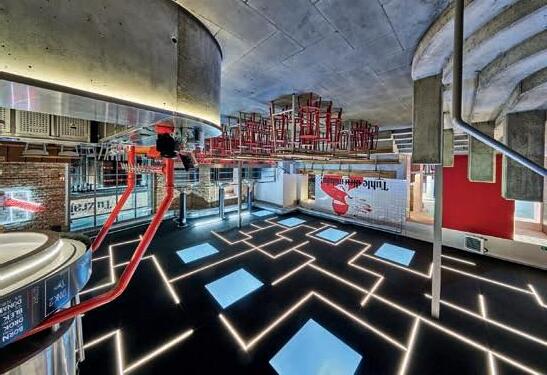 “A lively atmosphere with the iconic writing 'Love after midnight'.”