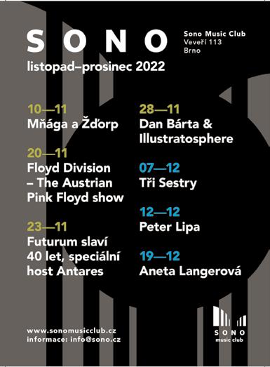 VOLBA, POSTEL cyklus diskusí provázek.studio 18.00 GAMEDEV AREA BEER & TALK #16 setkání Music Labs 18.30 CVIČENÍ ŽEN s prvky jógy a strečinku pro všechny věkové skupiny Dělnický dům Židenice 18.00, 19.00 SLAVNOSTNÍ ROZSVÍCENÍ VÁNOČNÍHO STROMEČKU V ZÁBRDOVICÍCH Pod Platany, Brno-Zábrdovice 17.00 VÝSTAVY MILENA DOPITOVÁ: PŘÍŠTÍ ZASTÁVKA JE NA ZNAMENÍ A SVATOPLUK SLÁDEČEK, PAVEL PREISNER: O OTCÍCH, KTERÝM DĚTI POMÁHAJÍ VYRŮST vernisáž výstav DUMB 18.00 DIVADLO MIMINÍ DIVADLO: PLAVBA ZA DUHOU pro děti Divadlo Radost 15.30 LOUSKÁČEK balet, lektorský úvod před představením Janáčkovo divadlo 18.00 TI DRUZÍ činohra MdB 18.00 VŠECHNO SE VŠÍM SOUVISÍ premiéra Leitnerka 18.00 SATURNIN činohra Mahenovo divadlo 19.00 ZTÍŽENÁ MOŽNOST SOUSTŘEDĚNÍ činohra Divadlo Reduta 19.00 BESÍDKA scénky Divadlo Bolka Polívky 19.00 FRANKENSTEIN – SKUTEČNÝ PŘÍBĚH muzikál Divadlo na Orlí 19.00 PRETTY WOMAN muzikál MdB 19.00 HUMANISMUS 2022 drama HaDivadlo 19.30 ŠTĚSTÍČKO drama Industra 20.00 HUDBA MADRIGAL VČERA A DNES klasika augustiniánské opatství Staré Brno 19.00 MLADÁ KREV ANEB HUDBA ZBLÍZKA I Besední dům 19.00 JIŘÍ PAVLICA & HRADIŠŤAN KC Semilasso 19.00 4TET VERZE VSono Music Club 19.00 CIVILNÍ OBRANA + CROSS THE MAZE + NOHOW punk, rock Melodka