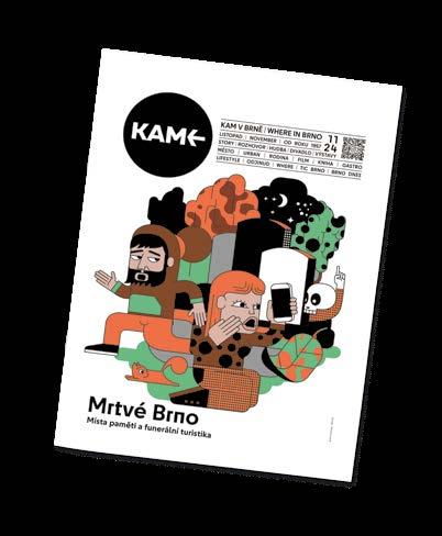 KAM v Brně… Vychází od roku 1957 | Číslo vydání: 11/2024 | MK ČR E 12197 | Vydává: TIC BRNO, příspěvková organizace, Radnická 365/2, 602 00 Brno, www.ticbrno.cz | Dodává: Pocket media s.r.o., Jakubské nám. 644/3, 602 00 Brno | IČO: 04541227, DIČ: CZ-04541227 | e-mail: info@pocketmedia.cz | Redakce: redakce@pocketmedia.cz | Šéfredaktor: David Tieku | Editor: Filip Živný | Redakční okruh: Živný (živ), Radka Beránková (rb), Bára Jurášková (jur), Miloš Henkrich (mh), Anna Svobodová, Anna Kupčáková (ak), Andrea Polnická (and), Adéla Uhrová (uhr), Tereza Vondrášková (von), Petra Antalová (ls) | Jazyková korektura: Lucie Pokorná | Grafická úprava: Jindřiška Mikešová | Sazba: Kamila Hrubešová | Autor ilustrace na obálce: Jiří Král | Foto: Viola Hertelová | Inzerce: obchod@pocketmedia.cz | + 420 608 101 550, + 420 604 239 957 | Přetisk materiálů pouze se souhlasem redakce | Příští vydání vychází: 1. 12. 2024 | Cena pro předplatitele: 63 Kč | FB a IG: @kamwhere | Anglické texty jsou vytvářeny ve spolupráci s Ritou Deanovou, Brno Daily, Centrem pro cizince JMK a Brno Expat Centre | REDAKCE NENESE ODPOVĚDNOST ZA OBSAHOVOU SPRÁVNOST MATERIÁLŮ A INFORMACÍ, ZMĚNY PROGRAMŮ A REKLAM | Předplatné: info@pocketmedia.cz / shop.pocketmedia.cz
