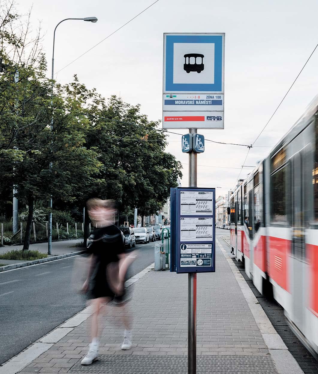 První vlaštovkou městské hromadné dopravy se v roce 1863 staly omnibusy, koněspřežné vozy pro 7–20 cestujících, které jezdily na pravidelných trasách podle jízdního řádu a s pevným tarifem. O několik let později protkaly ulice koleje a 17. srpna 1869 byla slavnostně zprovozněna trať z Moravského náměstí (tenkrát zastávka Kiosek) směrem do Králova Pole (Kartouzy) – tuto první jízdu označuje památník ve tvaru zastávkového označníku v dobovém stylu na dnešním Moraváku. Foto: Viola Hertelová / Pocket Media