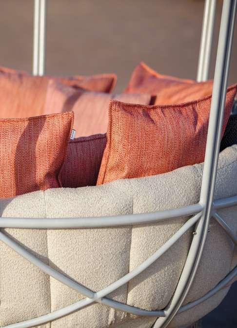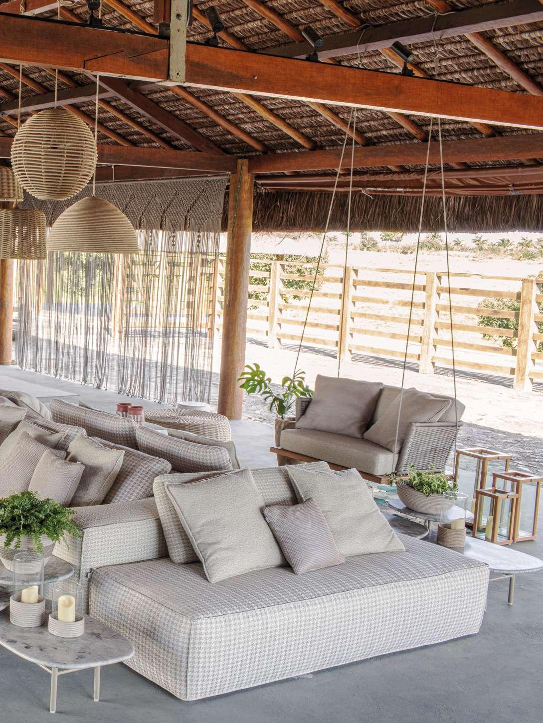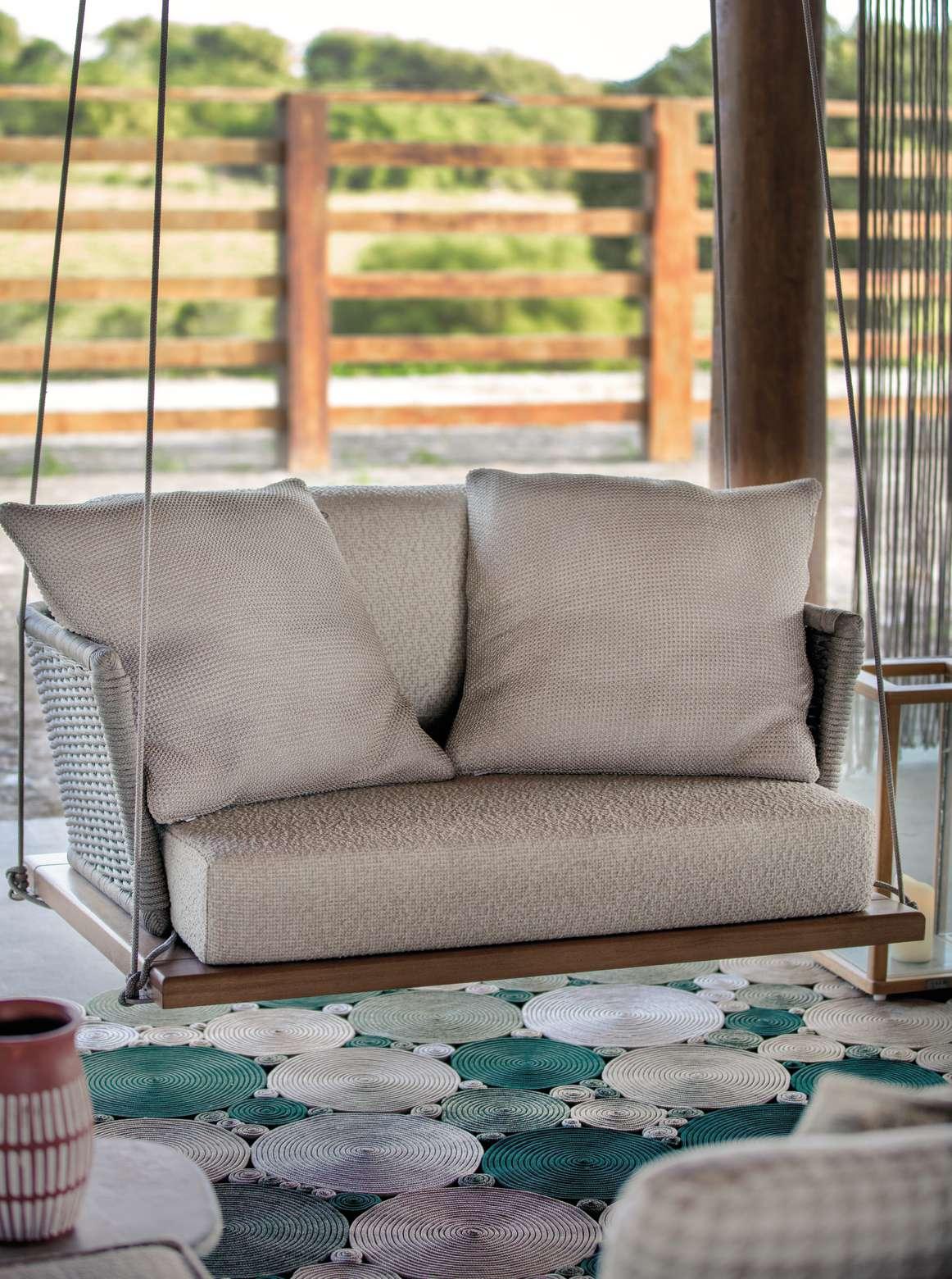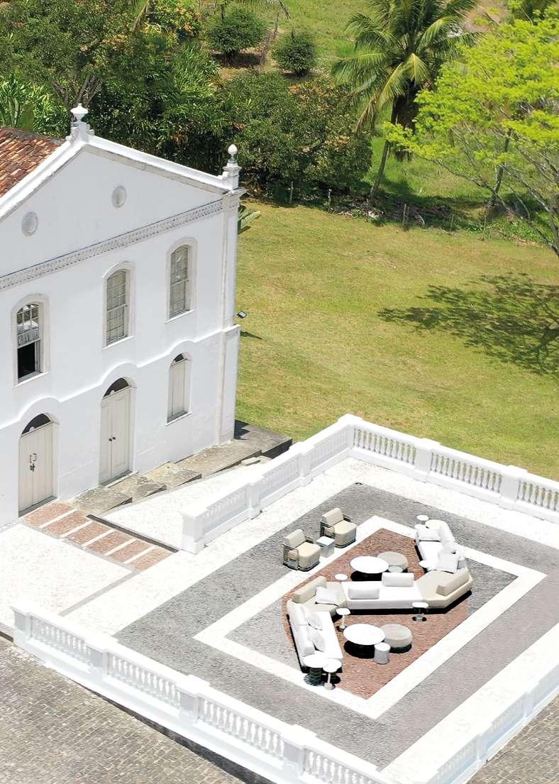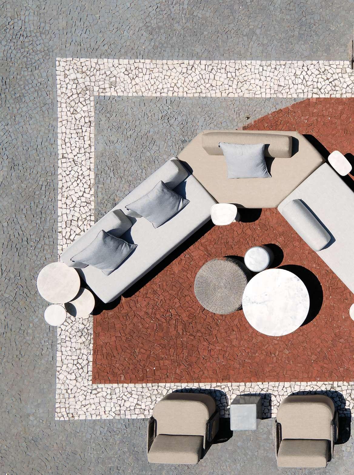 Módulos, braços e encostos Split, mesa de centro Marina, banco redondo IOS, mesas auxiliares, dupla e tripa Slim, tapete Cloud, namoradeira balanço Fusion, lanternas Club, luminárias Balão, pendentes Cônico, Cesta, Cilindro e Maui, Vasos, acessórios, mesa Pucon e cadeiras Padang.