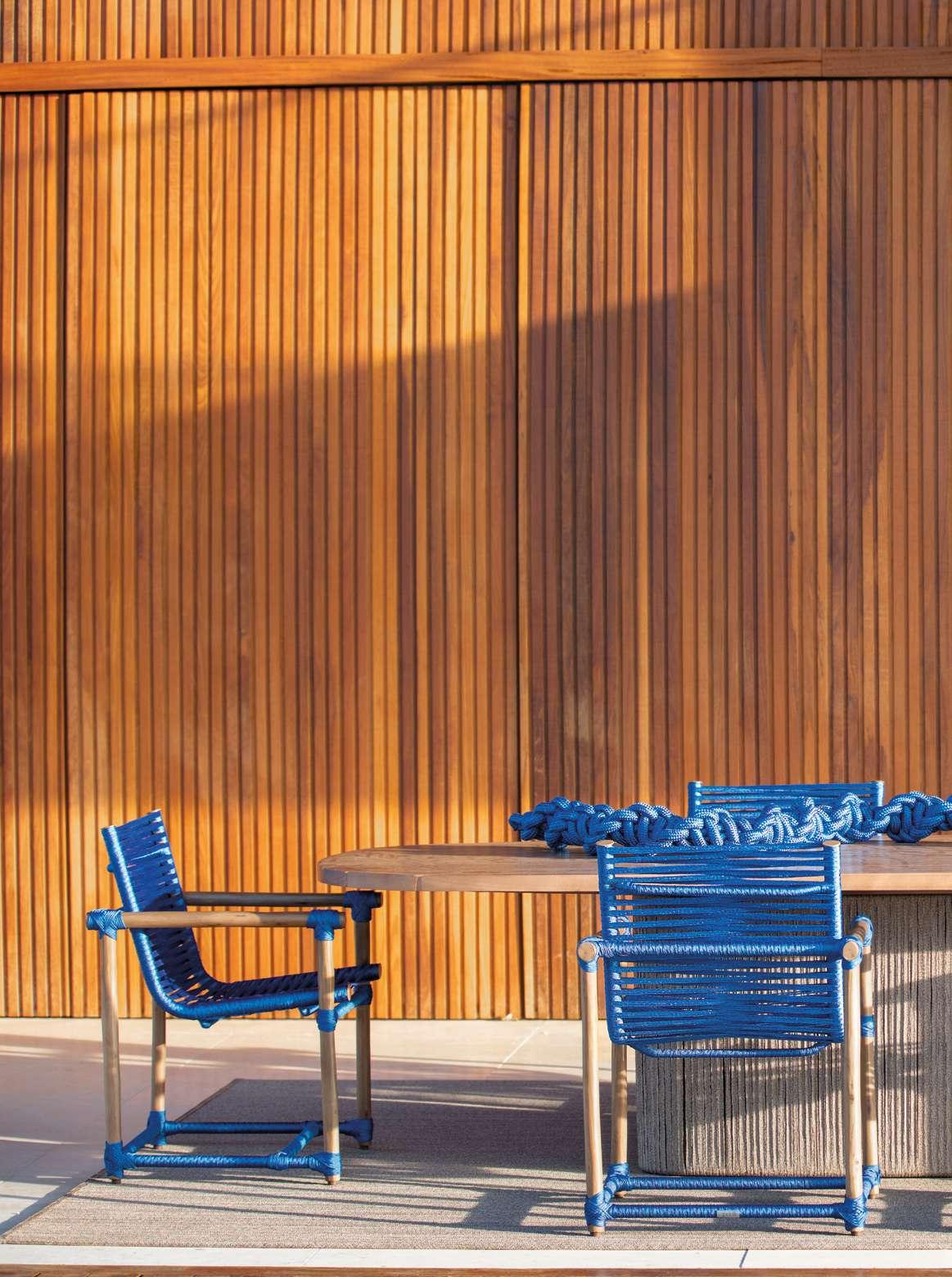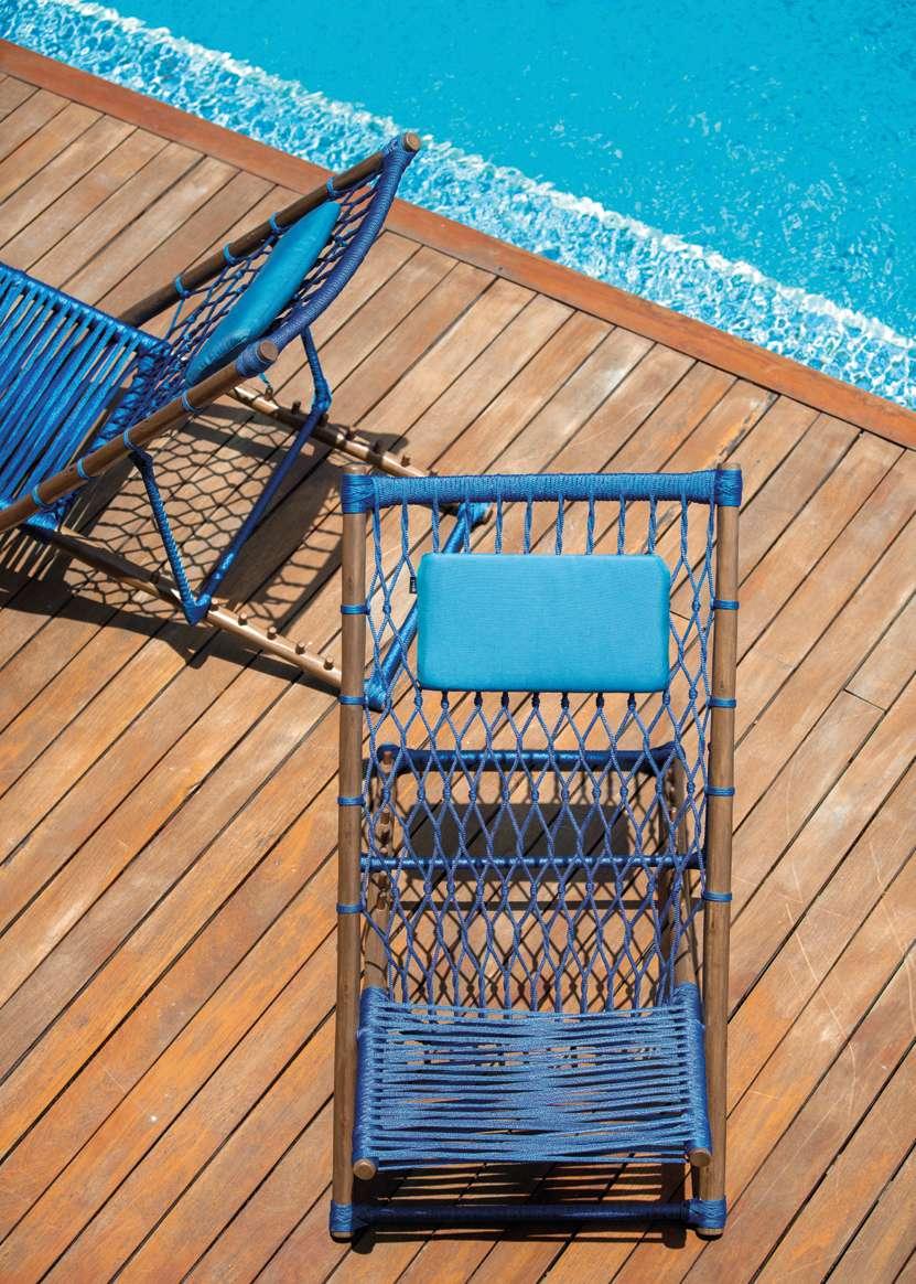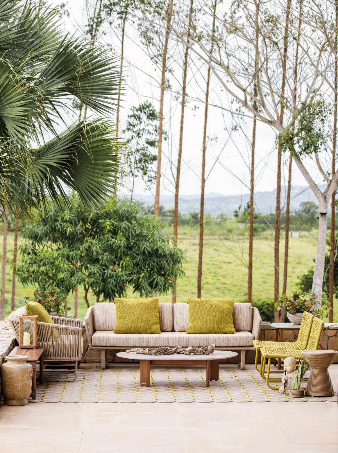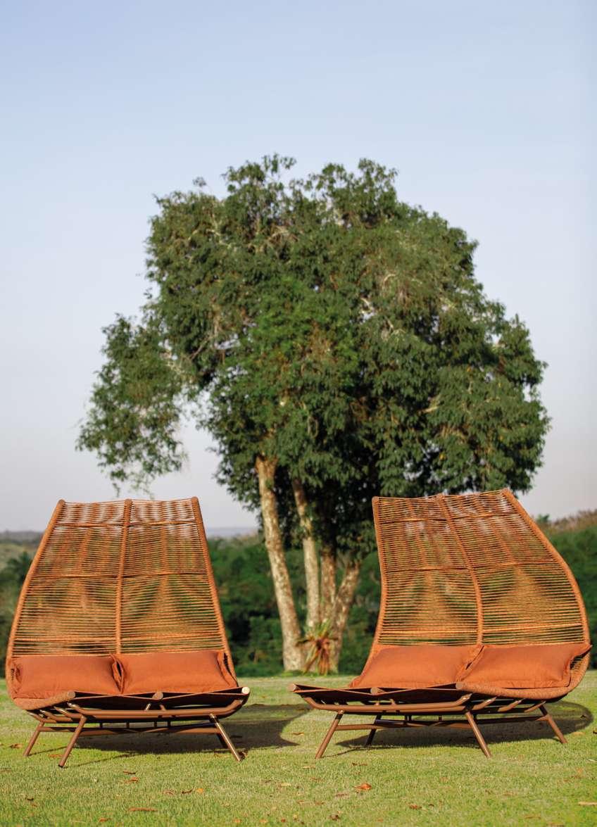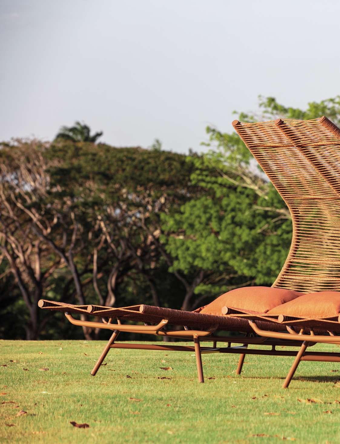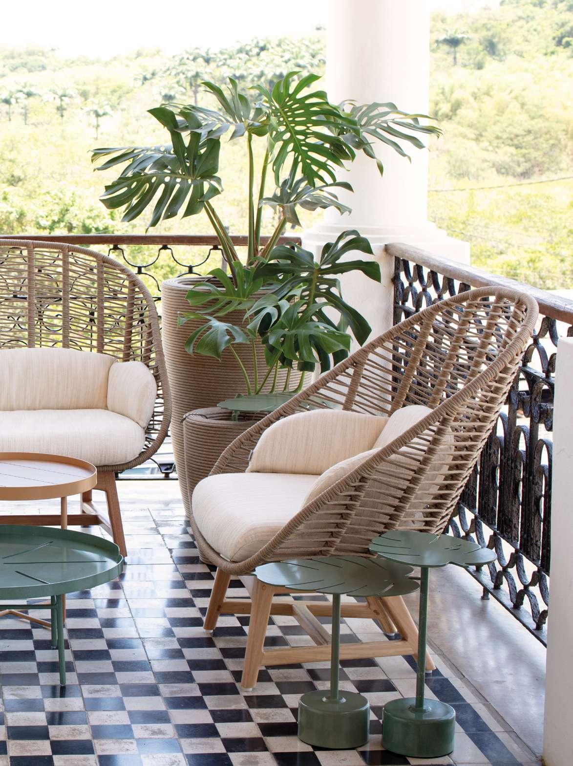 Shell chairs, lounge chairs and loveseat, Spool stool and side table, Rio tray table, Amazônia Vitória Régia coffee table, Amazônia Costela de Adão side tables, Tidelli planters, Kauai light pendant and Tidelli wall fixtures.