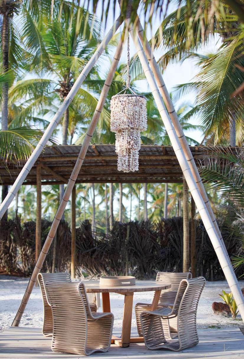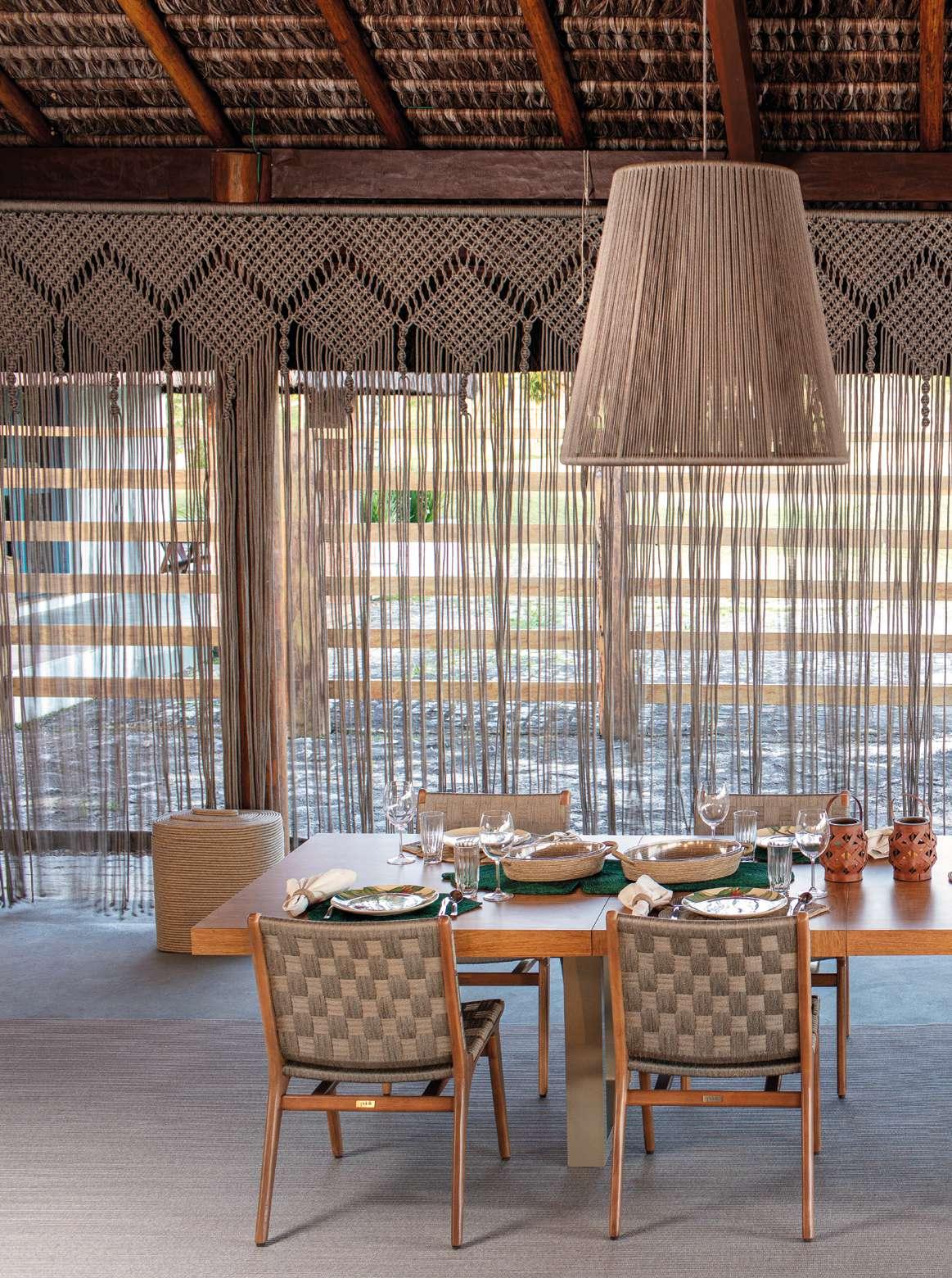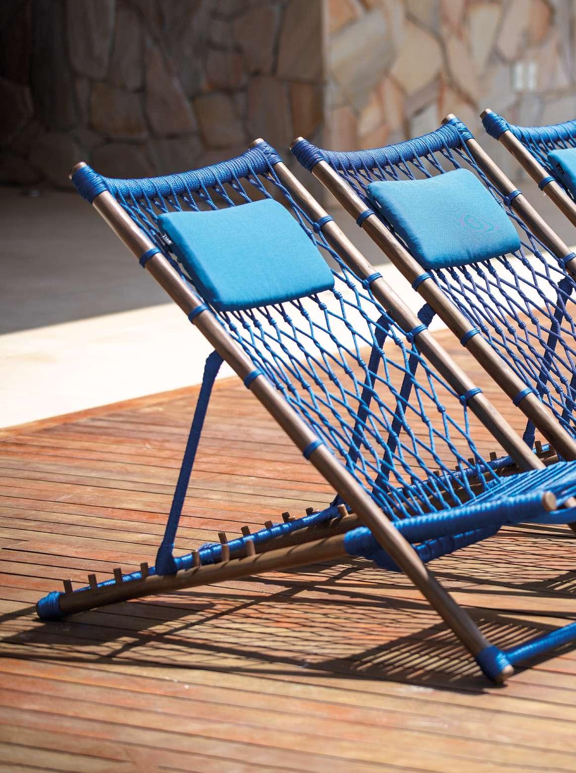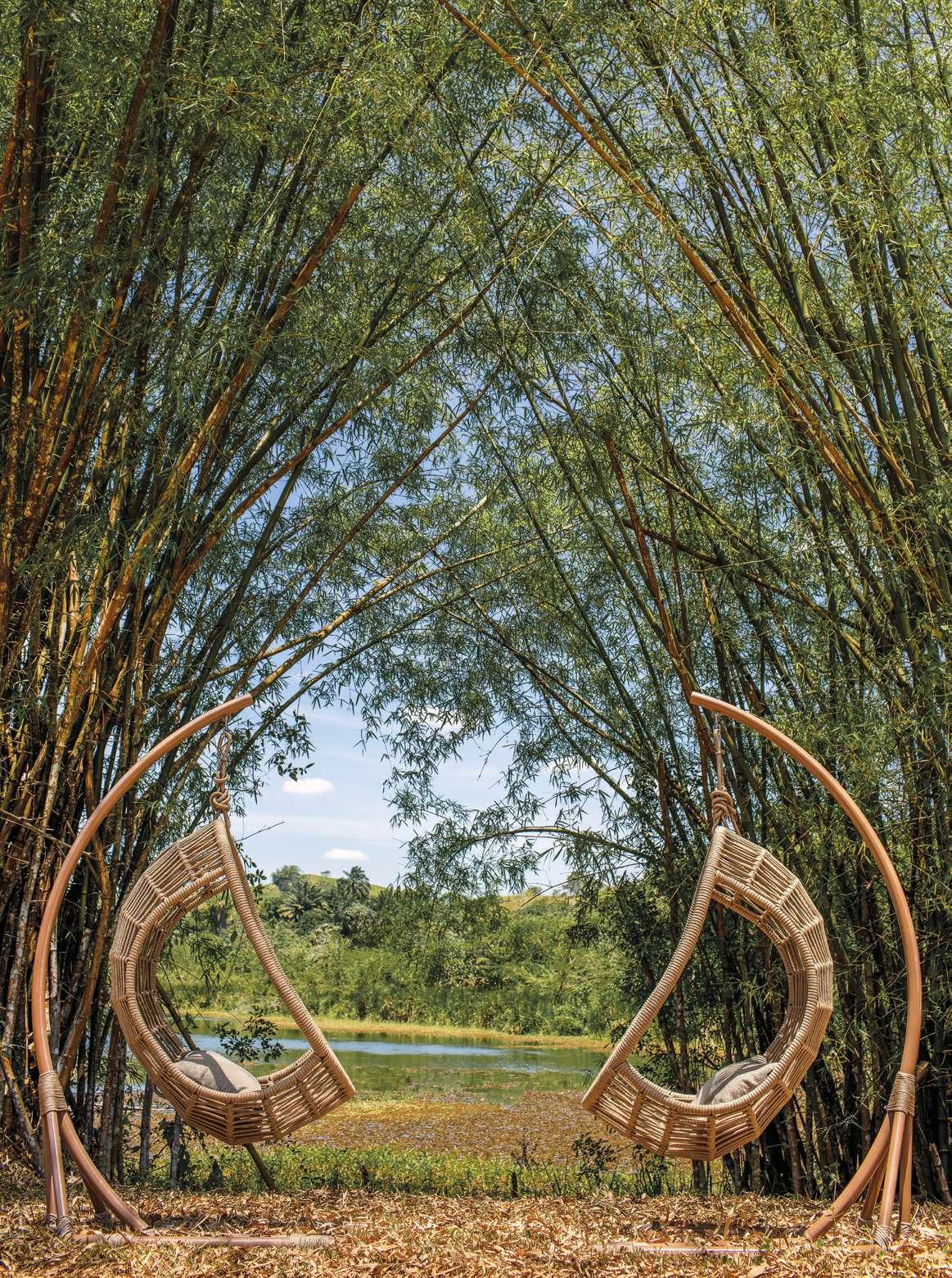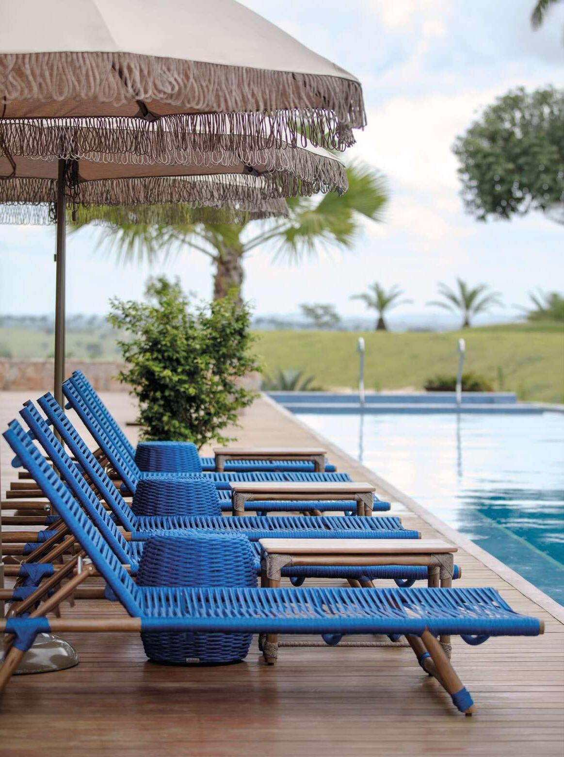 Shell chairs, lounge chairs and loveseat, Spool stool and side table, Rio tray table, Amazônia Vitória Régia coffee table, Amazônia Costela de Adão side tables, Tidelli planters, Kauai light pendant and Tidelli wall fixtures.