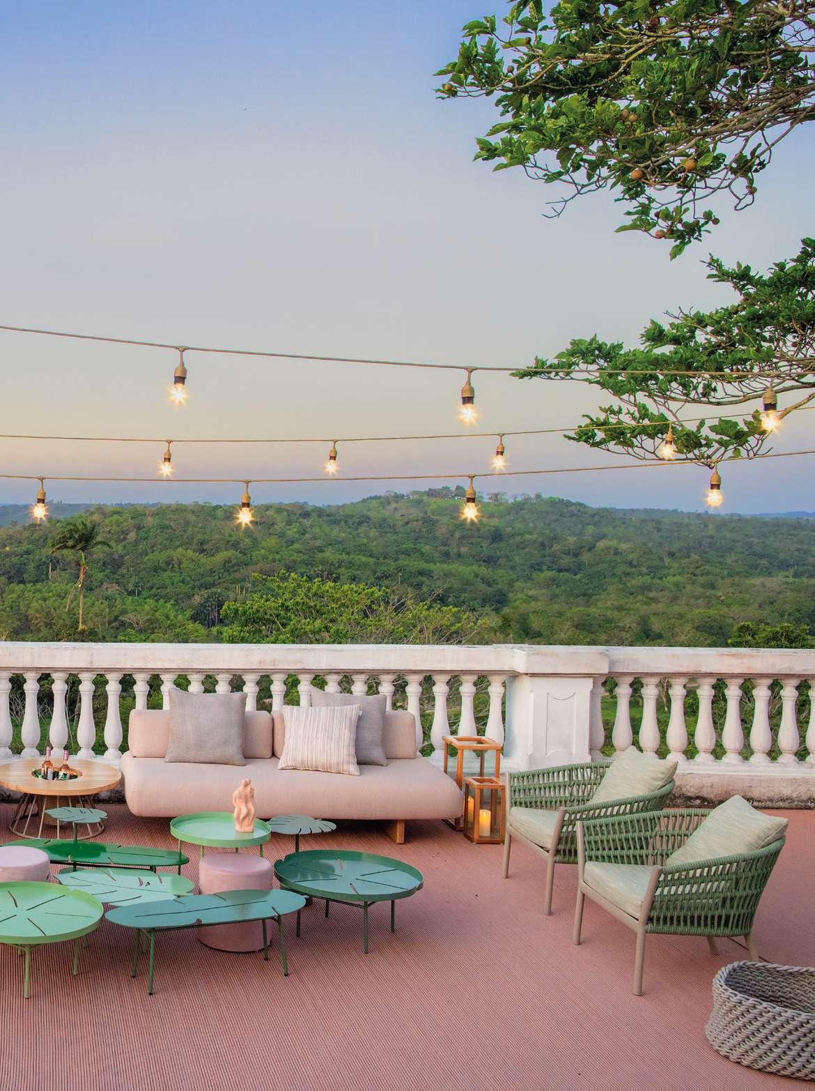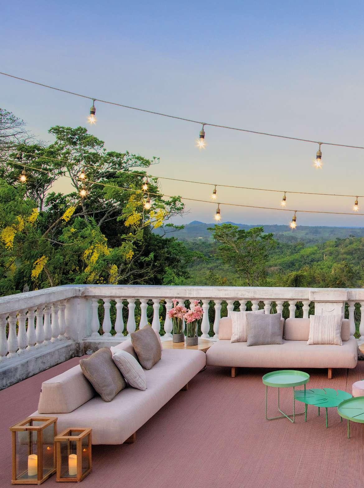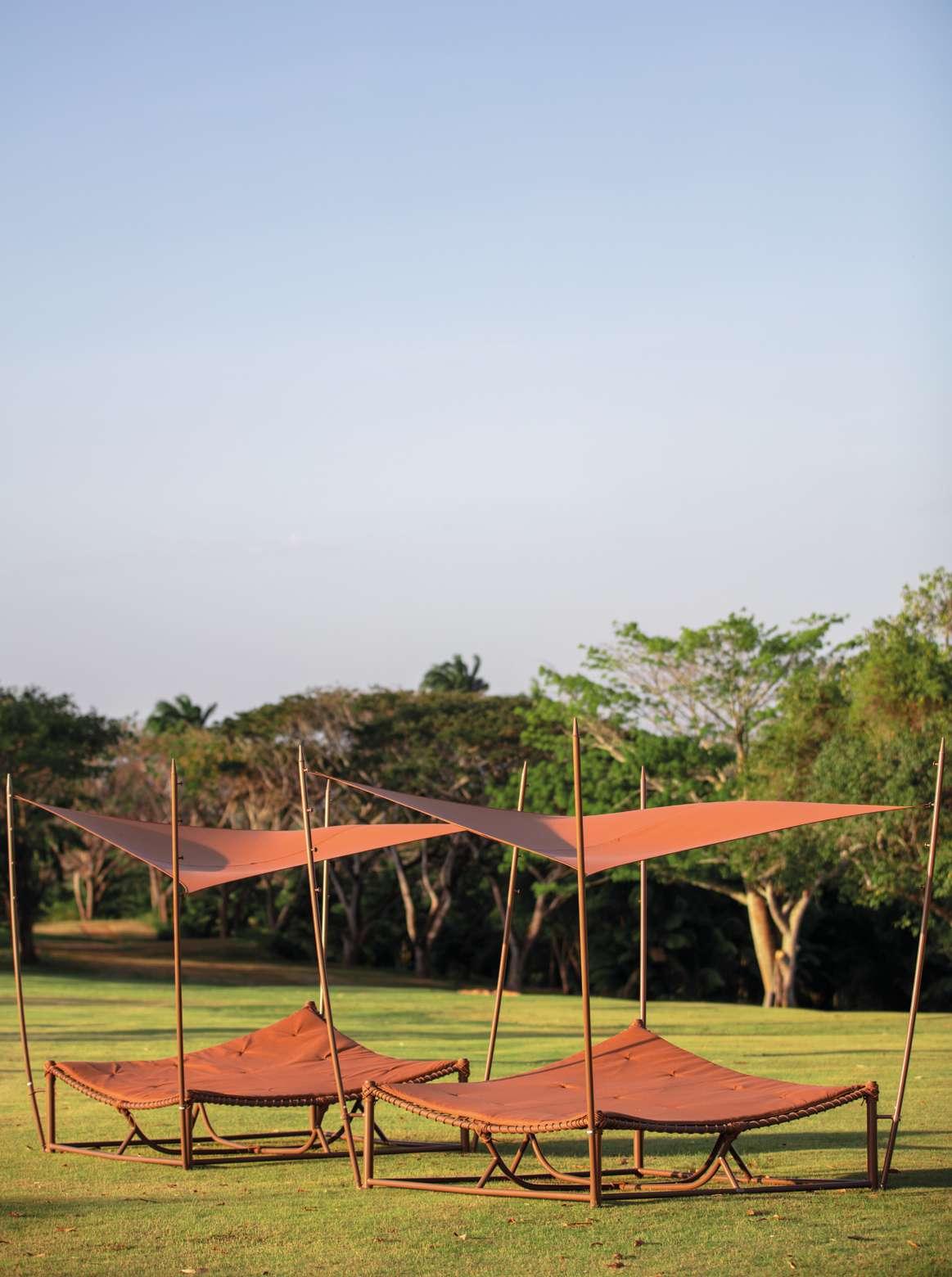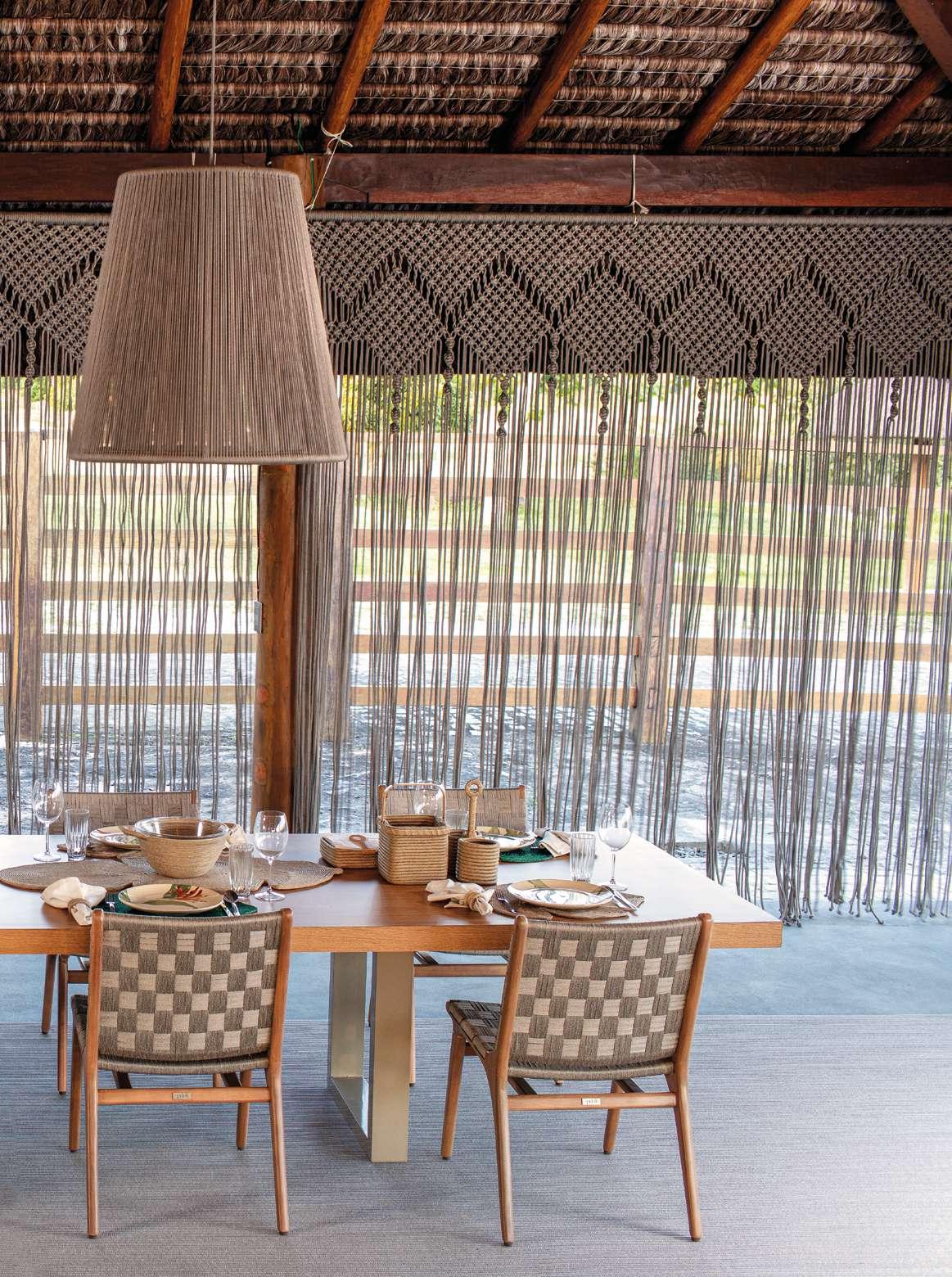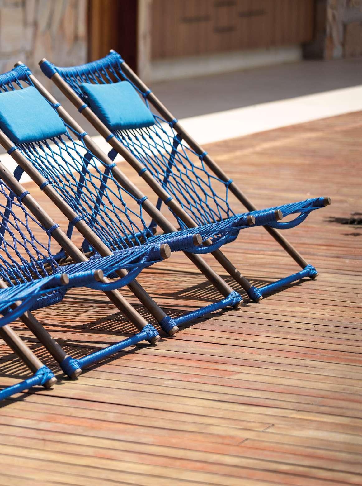 Shell chairs, lounge chairs and loveseat, Spool stool and side table, Rio tray table, Amazônia Vitória Régia coffee table, Amazônia Costela de Adão side tables, Tidelli planters, Kauai light pendant and Tidelli wall fixtures.