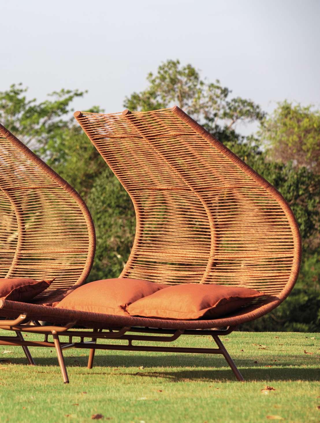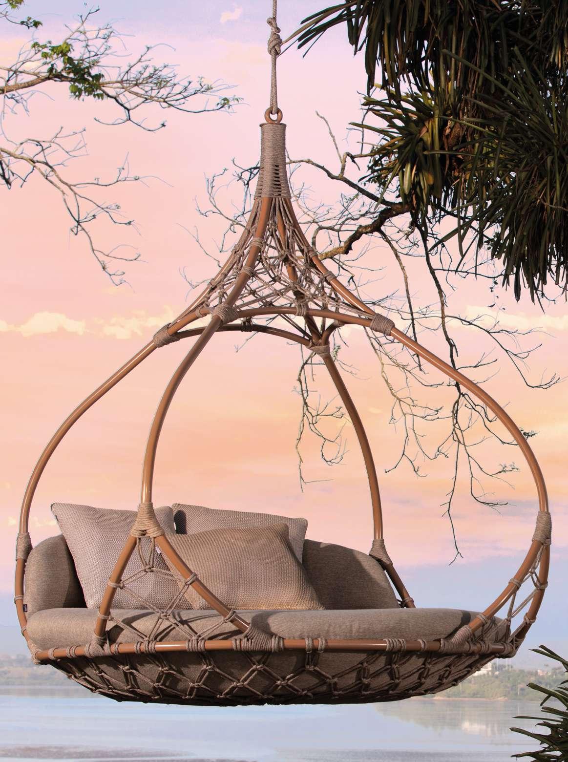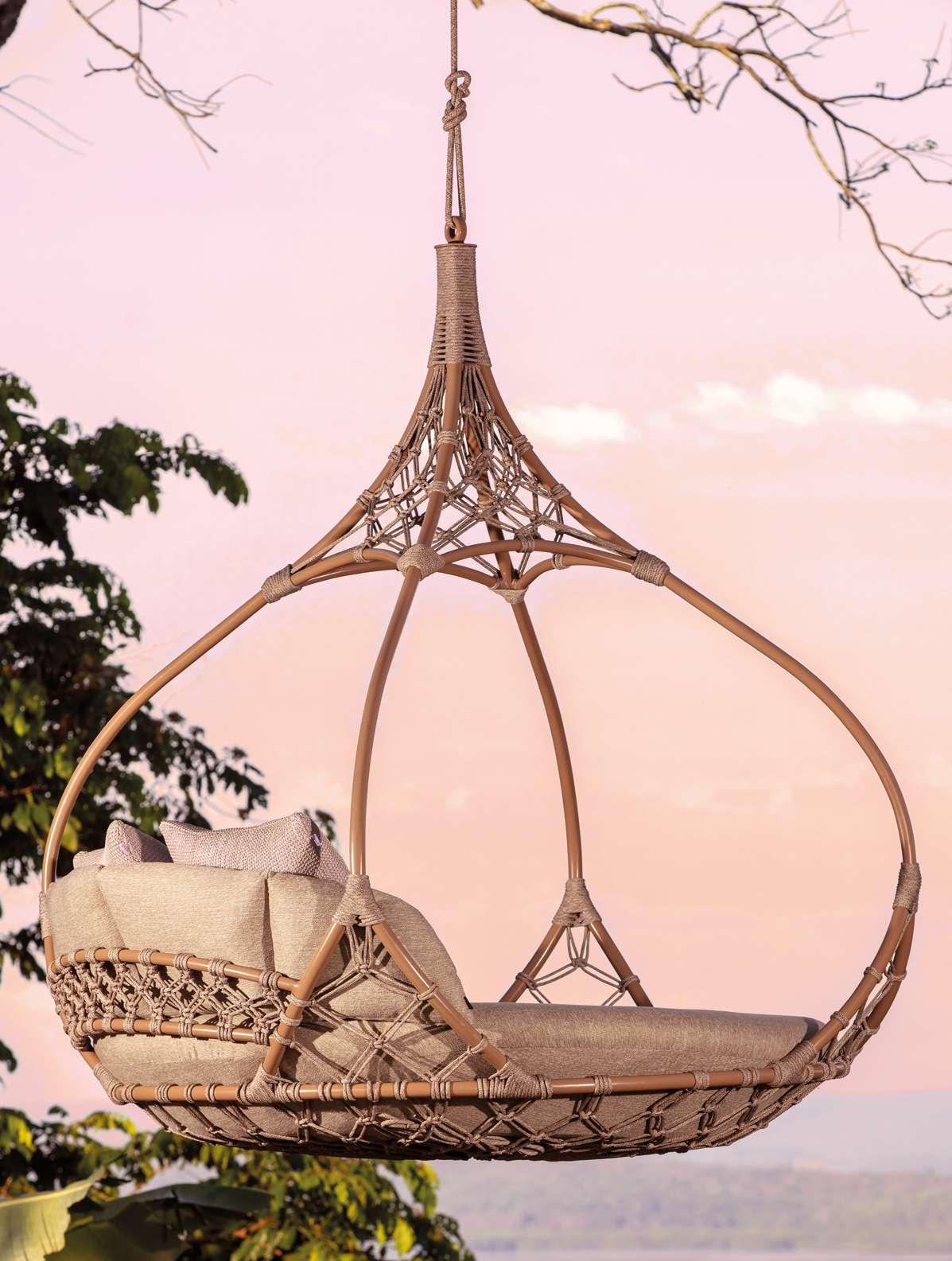 Tulum lounge chairs, Spool stool, floor light fixture, Maui planter, Kauai double swing, Spool coffee table, Marina ottoman and garden seat and Kauai light pendant.