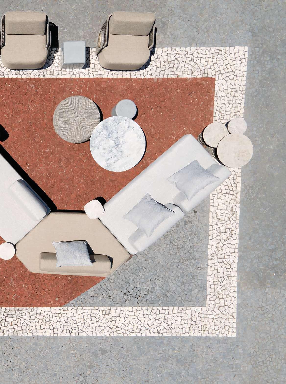 Marina ottoman and Marina garden seat, Fusion round table, Tulum sofa and Tidelli planter.