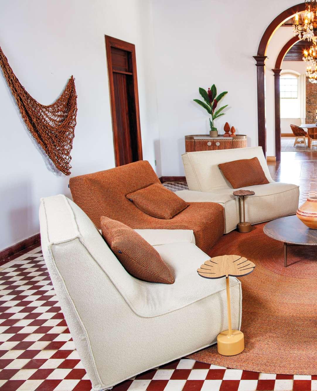 Poltronas Medellín, módulos Flex, encostos Pucon, bancos redondo e quadrado IOS, mesa de centro Marina e Bora Bora, mesas auxiliares Slim e Kauai e mesas laterais Kauai.