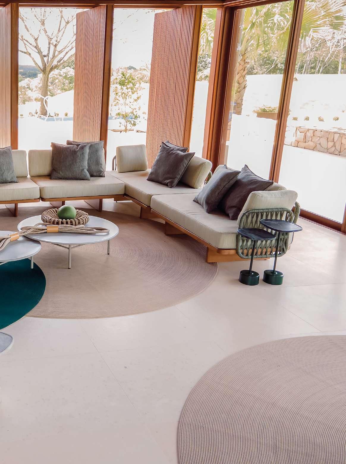 Medellín lounge chairs, Flex modules, Pucon backrests, IOS square and round stools, Marina and Bora bora coffee tables, Slim and Kauai coffee tables and Kauai side tables.