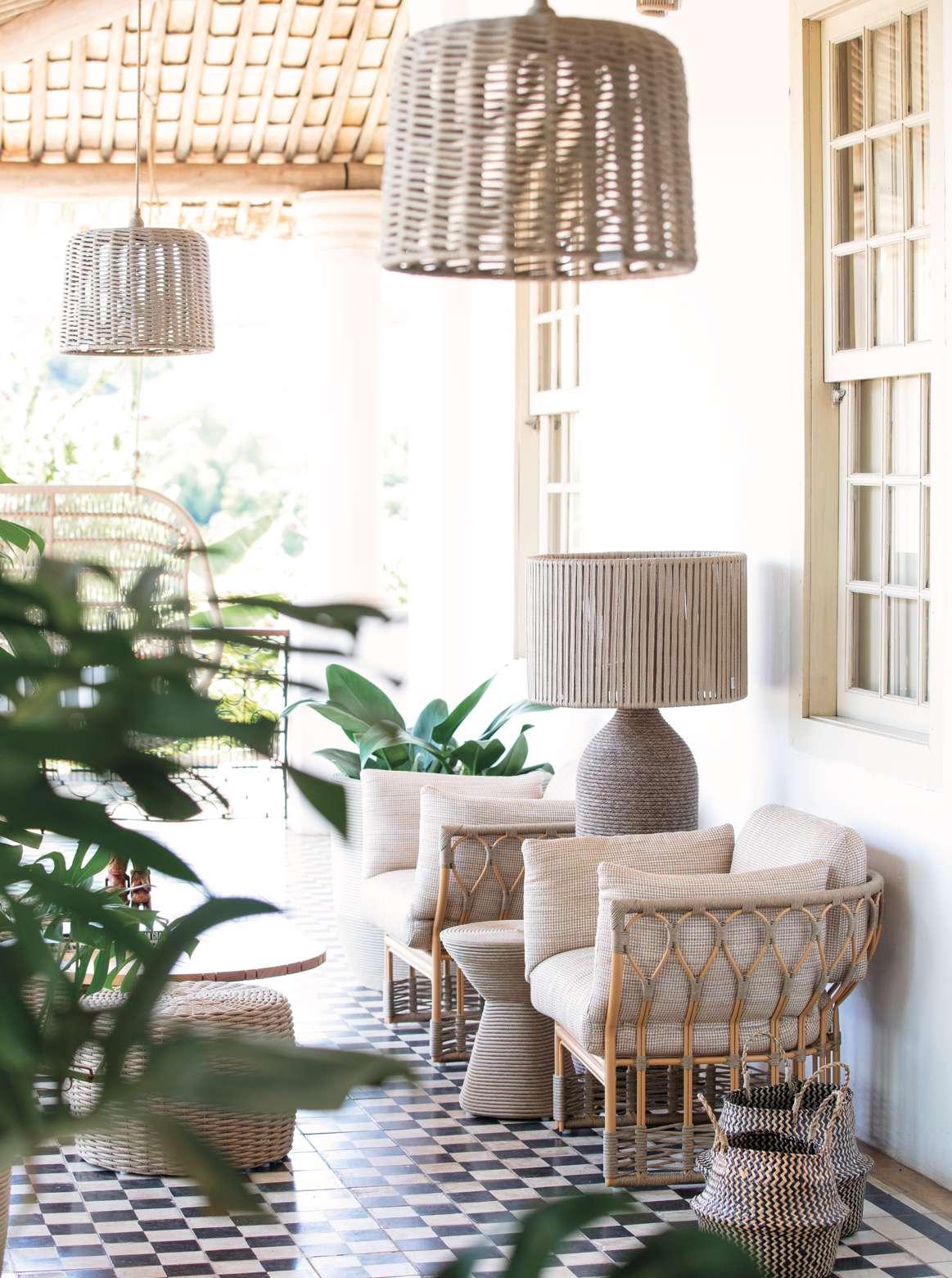 Composição - Poltronas Tulum, banco Spool, abajur piso, vaso Maui, concha dupla Kauai, mesa de centro Spool, puff e Garden seat Marina e luminária pendente cesta Kauai.