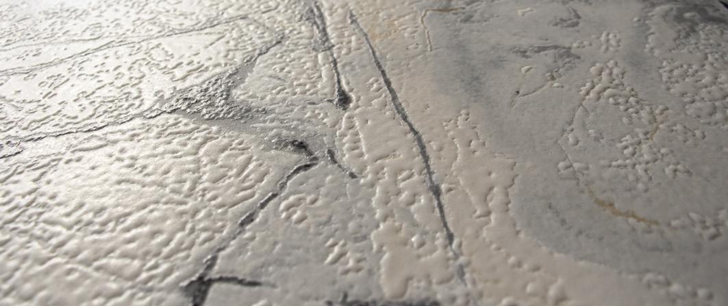 Today, three-dimensional ceramic surfaces are typically created using additive techniques, applying either solvent- or waterbased adhesives followed by grit. The grit is fixed in place either with digital adhesives, which are capable of bonding one or more types of grit, or by new-generation machines that apply water-based digital glazes prior to the engobe.