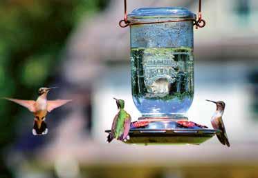 Dozens of hummingbirds battle over two feeders at the Lake Redwine home of Rick Gross. “Sometimes they land on the feeder when I’m still holding it,” he says. The top photo shows hummingbirds vying for position at the feeder, while the other is of a hummingbird perched on the end of a zip tie.