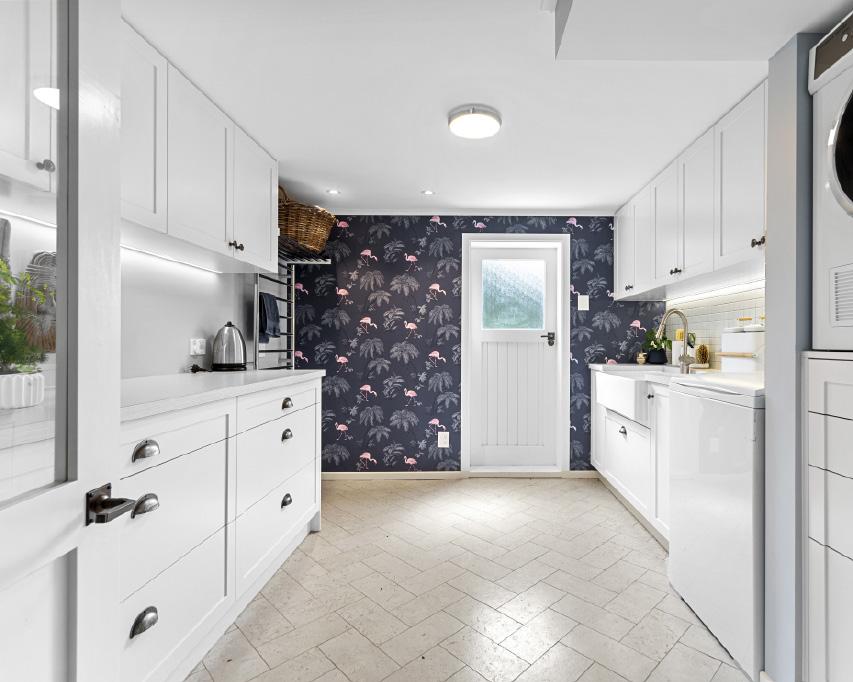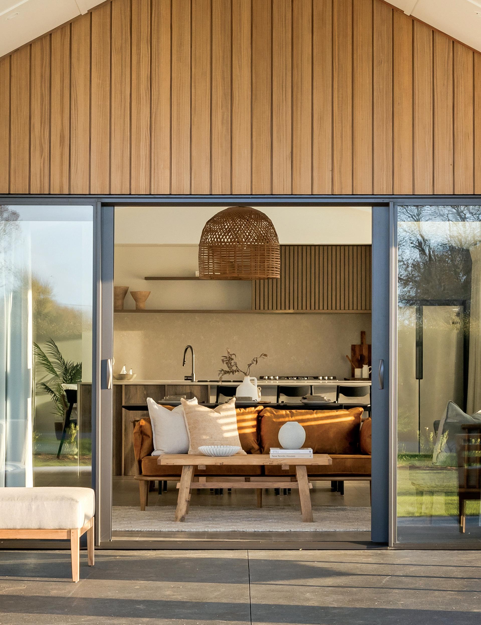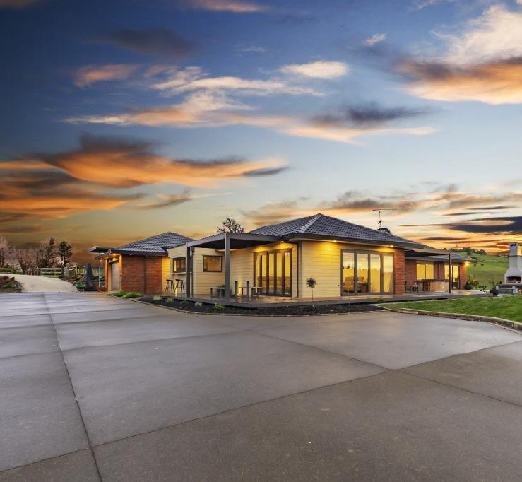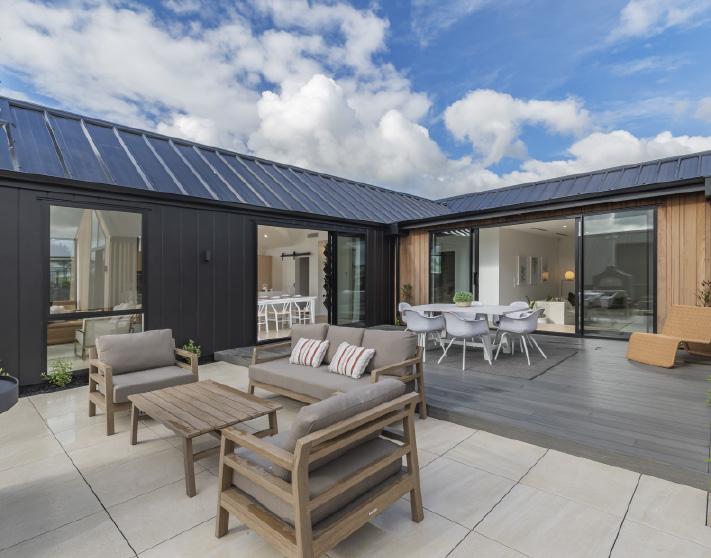 roof covers an exterior lounge area with a built-in fire and Weber barbeque. The benchtop is constructed in schist panels (an entertainer’s dream) with the kitchen overlooking extensive landscaped gardens.