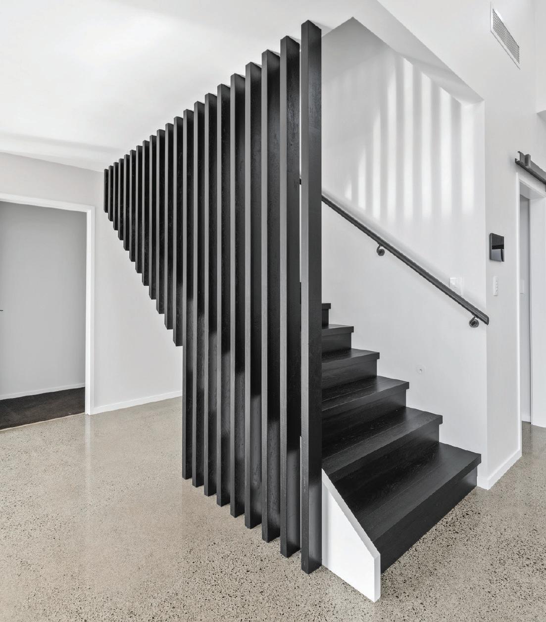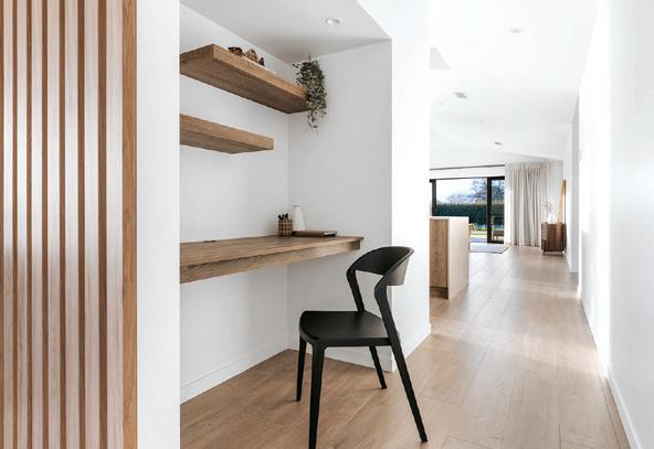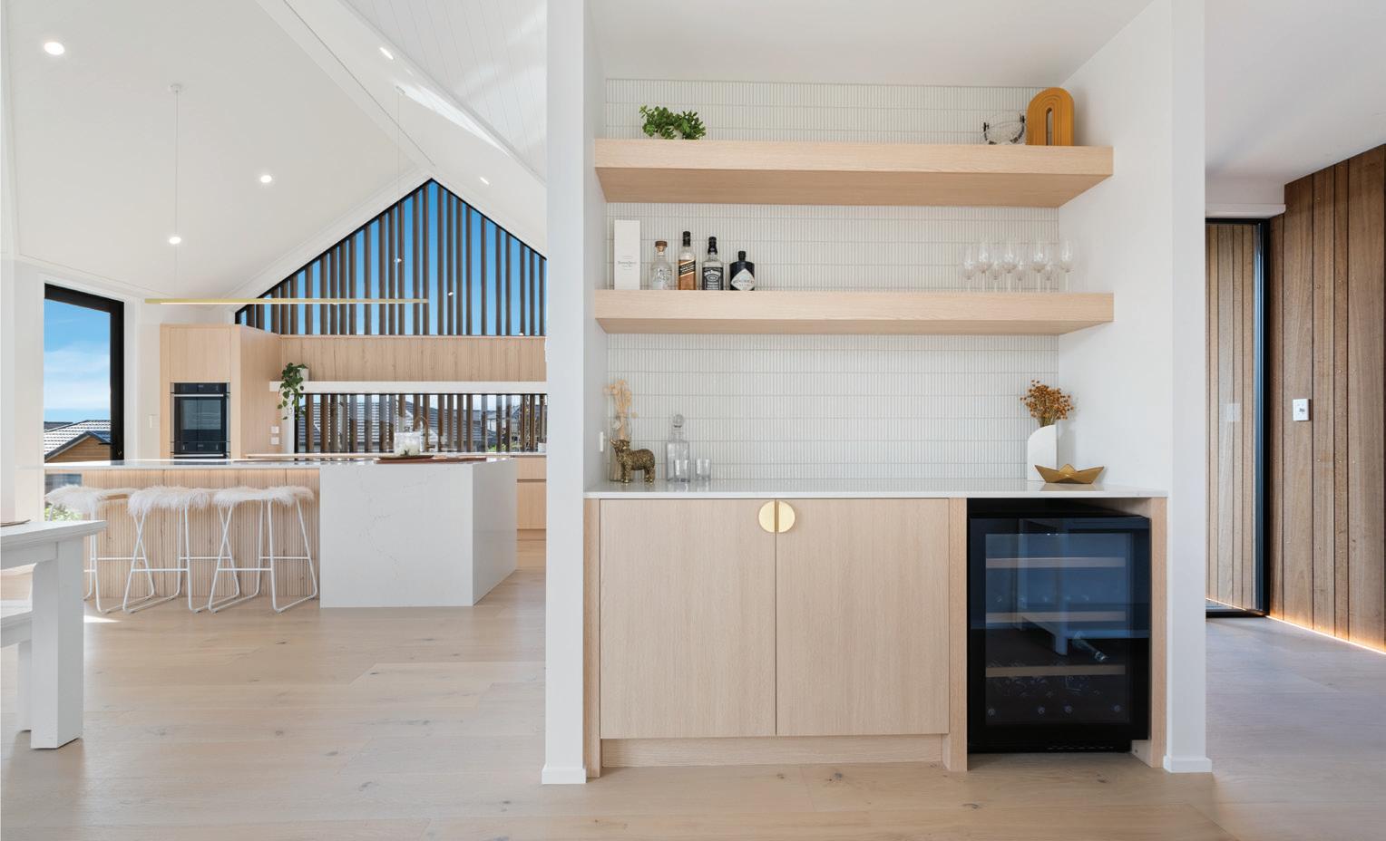 This striking 280sqm home features four bedrooms, open plan kitchen, dining and living areas. It incorporates an internal gas fire, featuring floating oak shelving on either side, under lit with LED lights. A private lounge with custom oak shelving and an extensive cellar and fridge create a real ‘wow’ factor. Off the entertainment space, an automated louvre