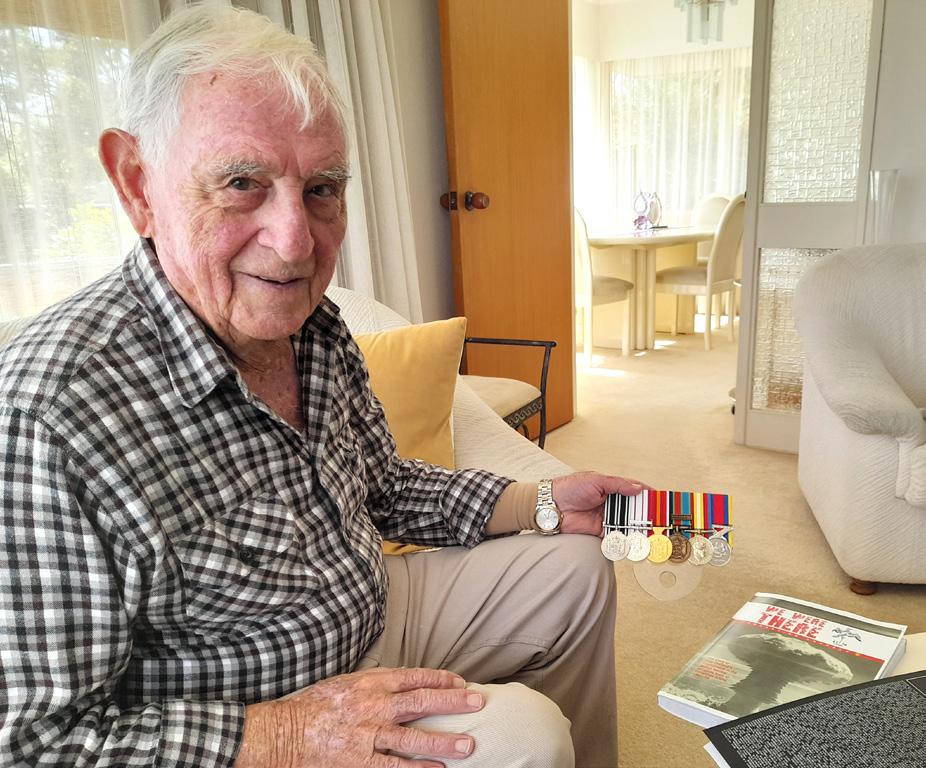 Former Royal New Zealand Navy serviceman Ivan McCabe with his military medals, including the Nuclear Testing Medal received in February 2024.