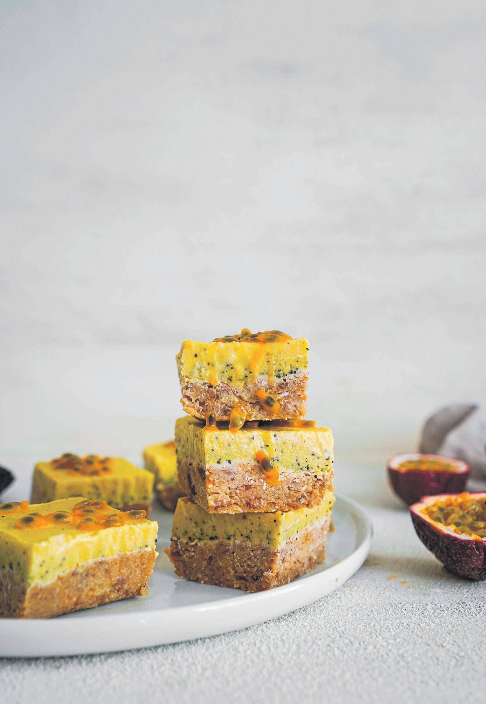 Once the slice is ready to serve, pour the remainder of the passionfruit pulp over the slice. Cut into squares and serve. This slice is best served cold and will need to be stored in the freezer so it doesn’t melt. Serves 8.