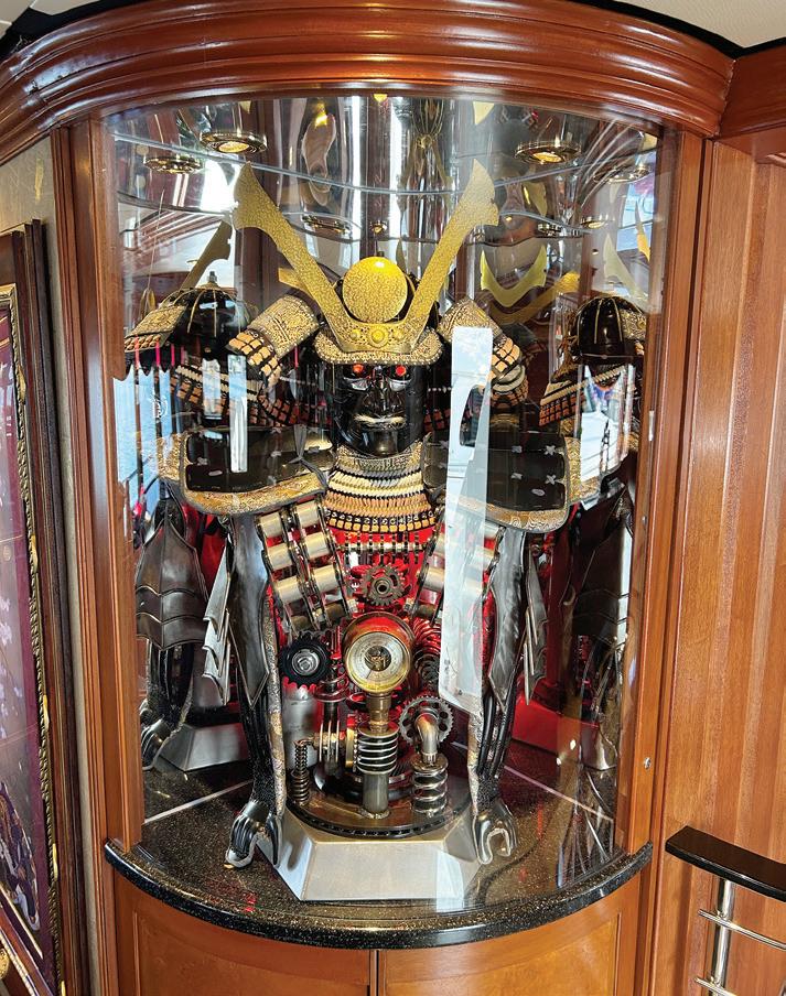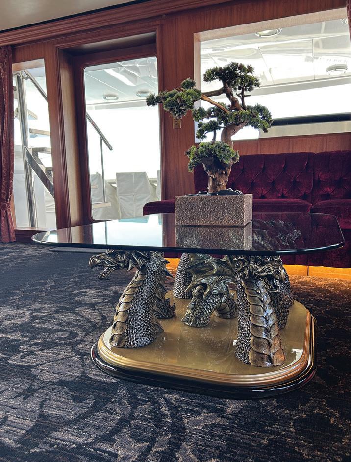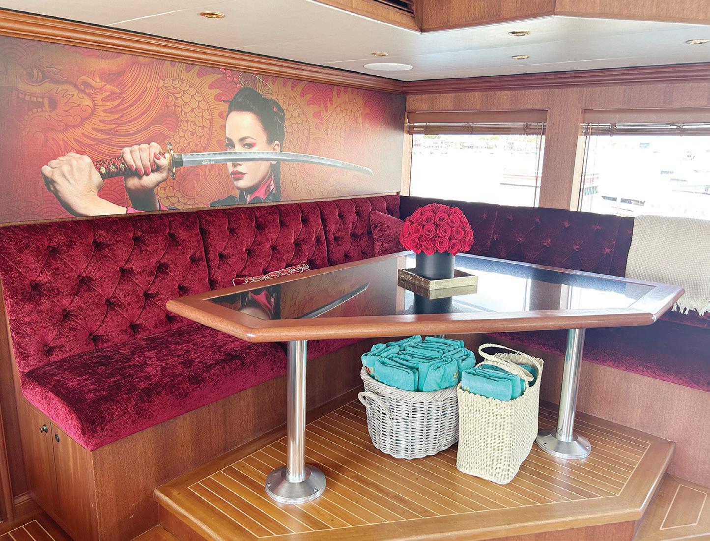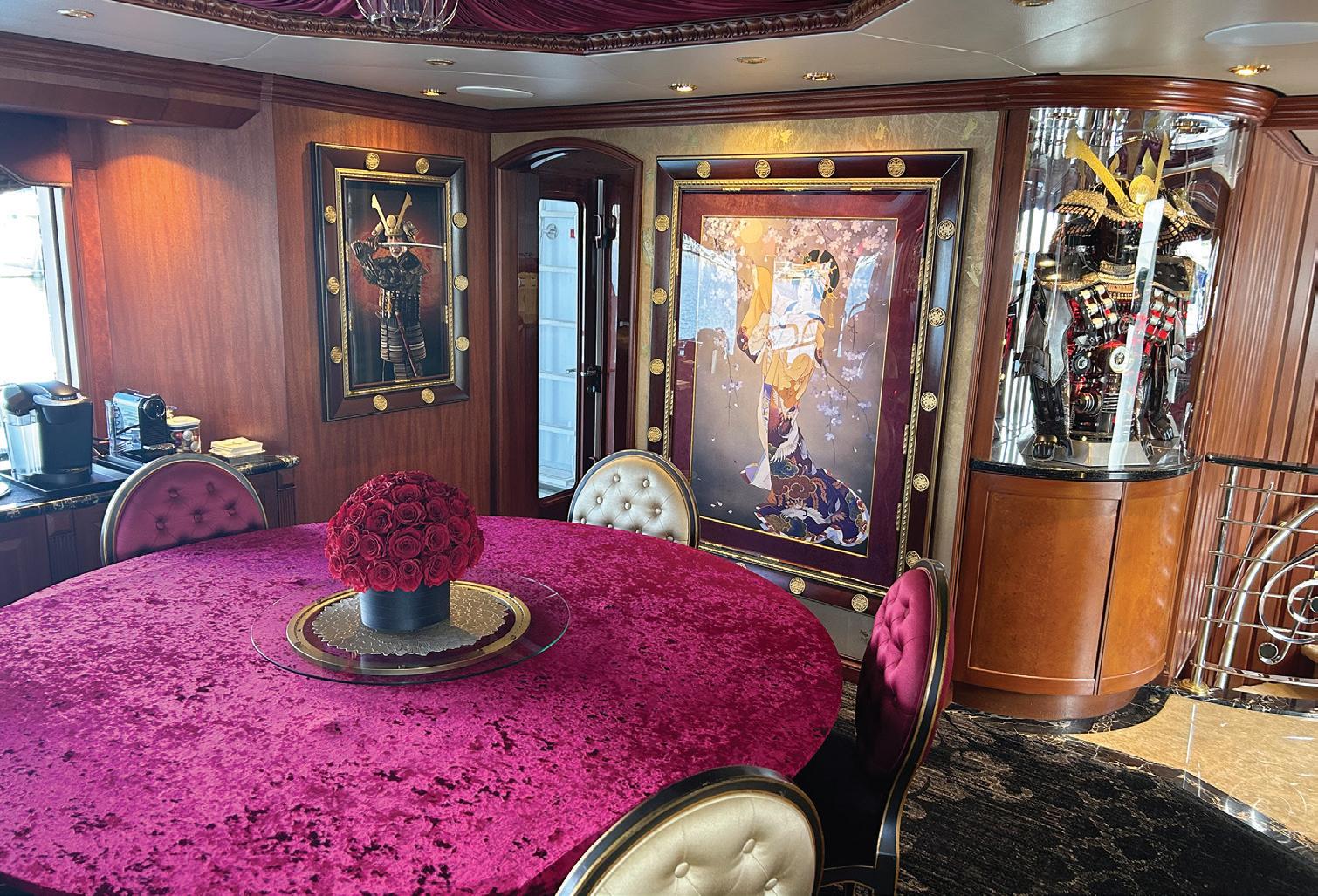 Barbarians,” is fitting. This yacht exudes both authority and grace. Once known as Lady Kath, Shogun has been meticulously maintained and recently transformed with an opulent interior redesign by Nardine Habib. Her lavish spaces are adorned with deep reds, vibrant golds,