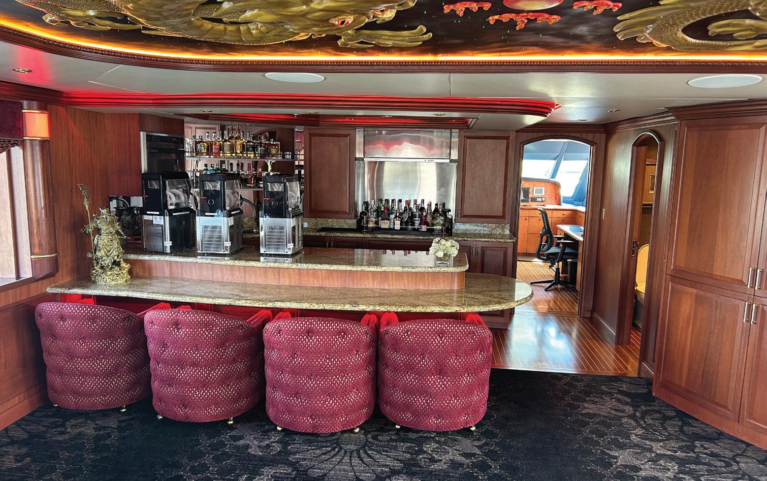 and intricate Eastern-inspired details that make each room feel like a royal chamber. Accommodating up to 12 guests in five stately staterooms, Shogun offers everything from a full-beam master suite with Jacuzzi to sweeping outdoor decks complete with alfresco dining and a sundeck hot tub with 360-degree views.