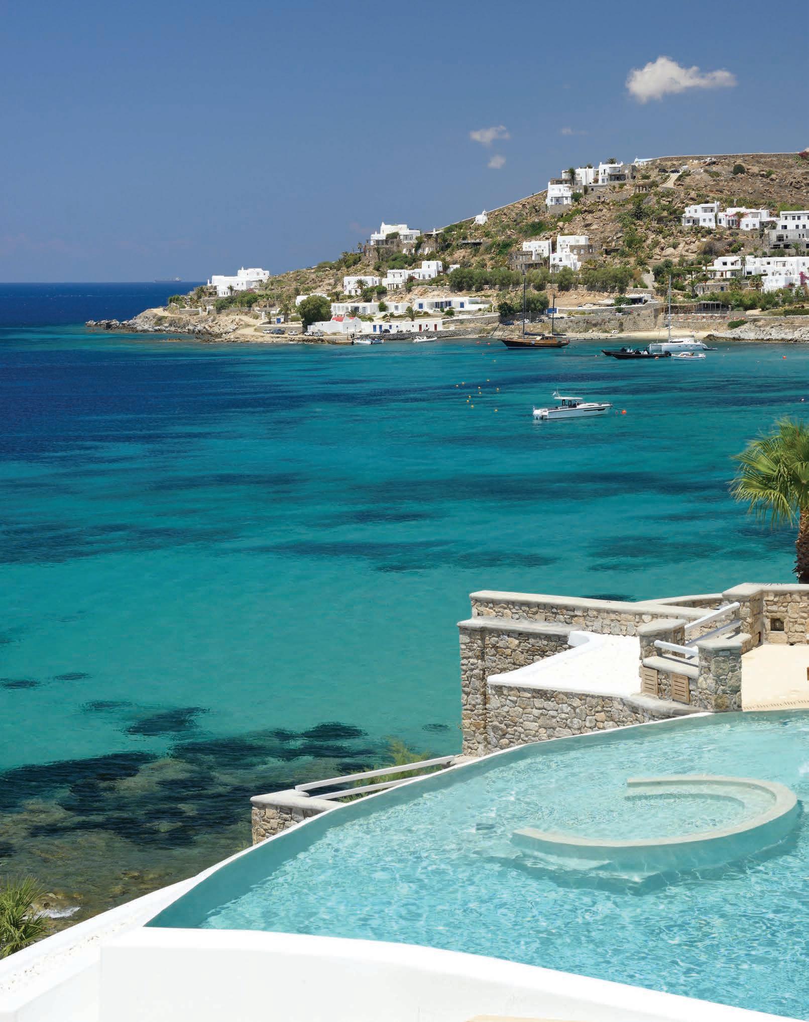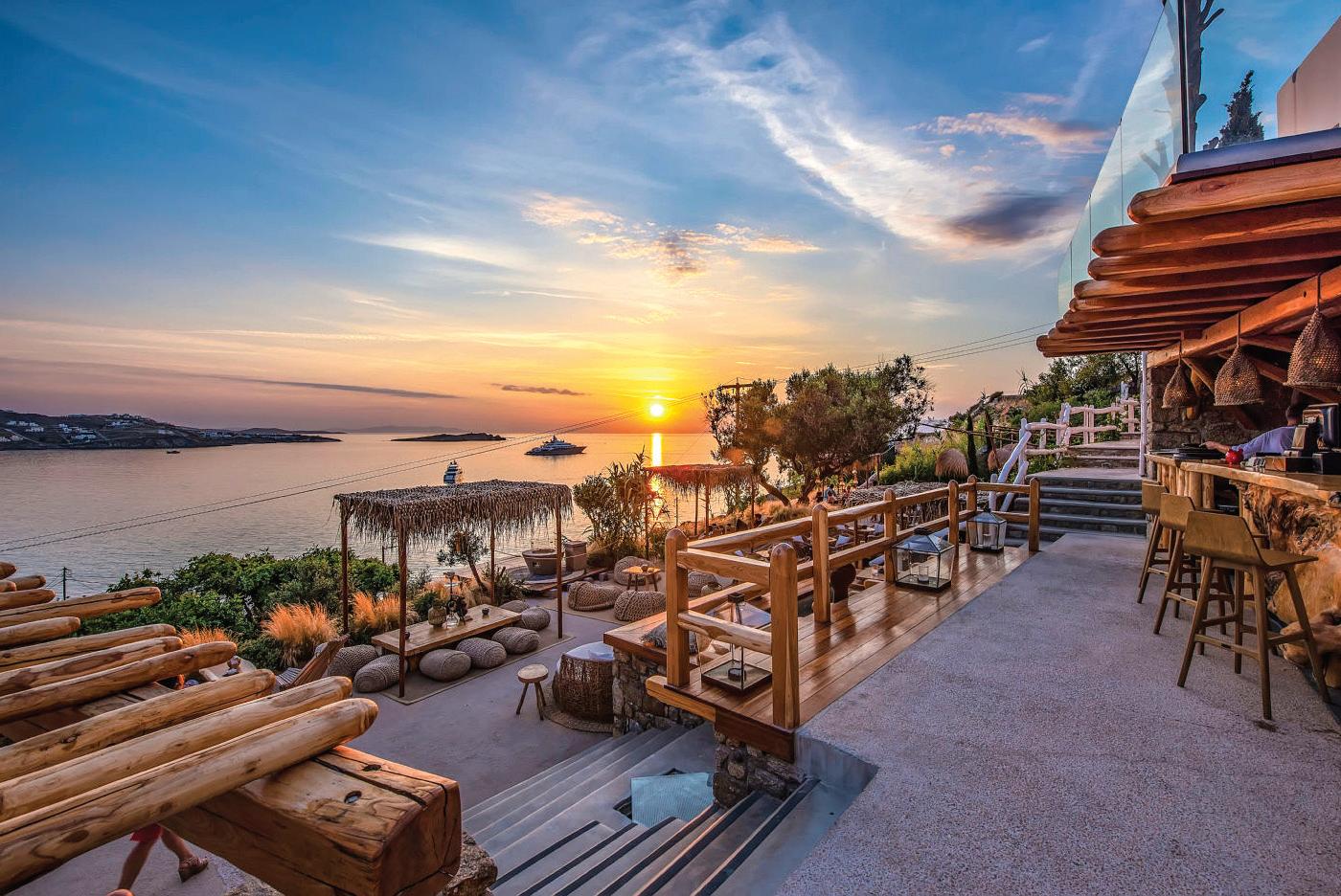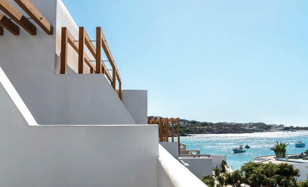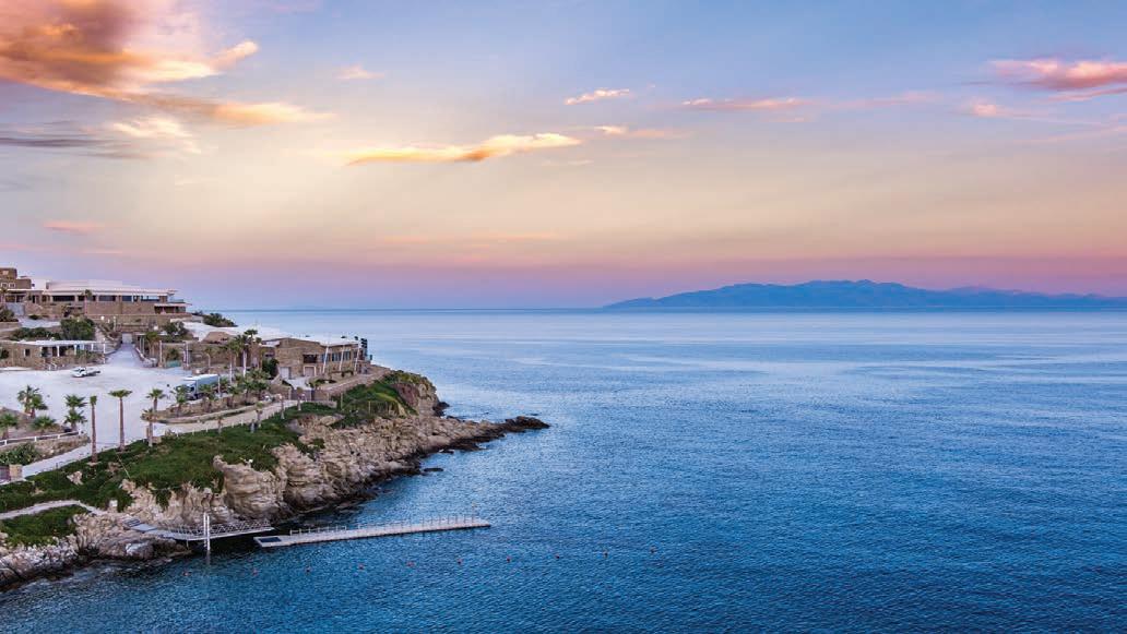 Of the 6,000 islands and islets rising from the Greek Seas — only 227 of which are inhabited — the allure of Mykonos has continuously ourished since it rst trended with travelers in the early 1960s. Mykonos’ geometric, whitewashed facades against the deep blues of the waters surrounding ancient islands like Delos are charming, yet as the island’s built up, few uninterrupted stretches of coastal views remain.