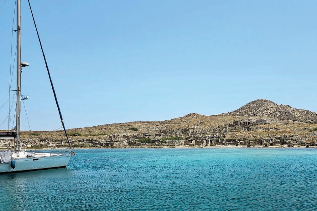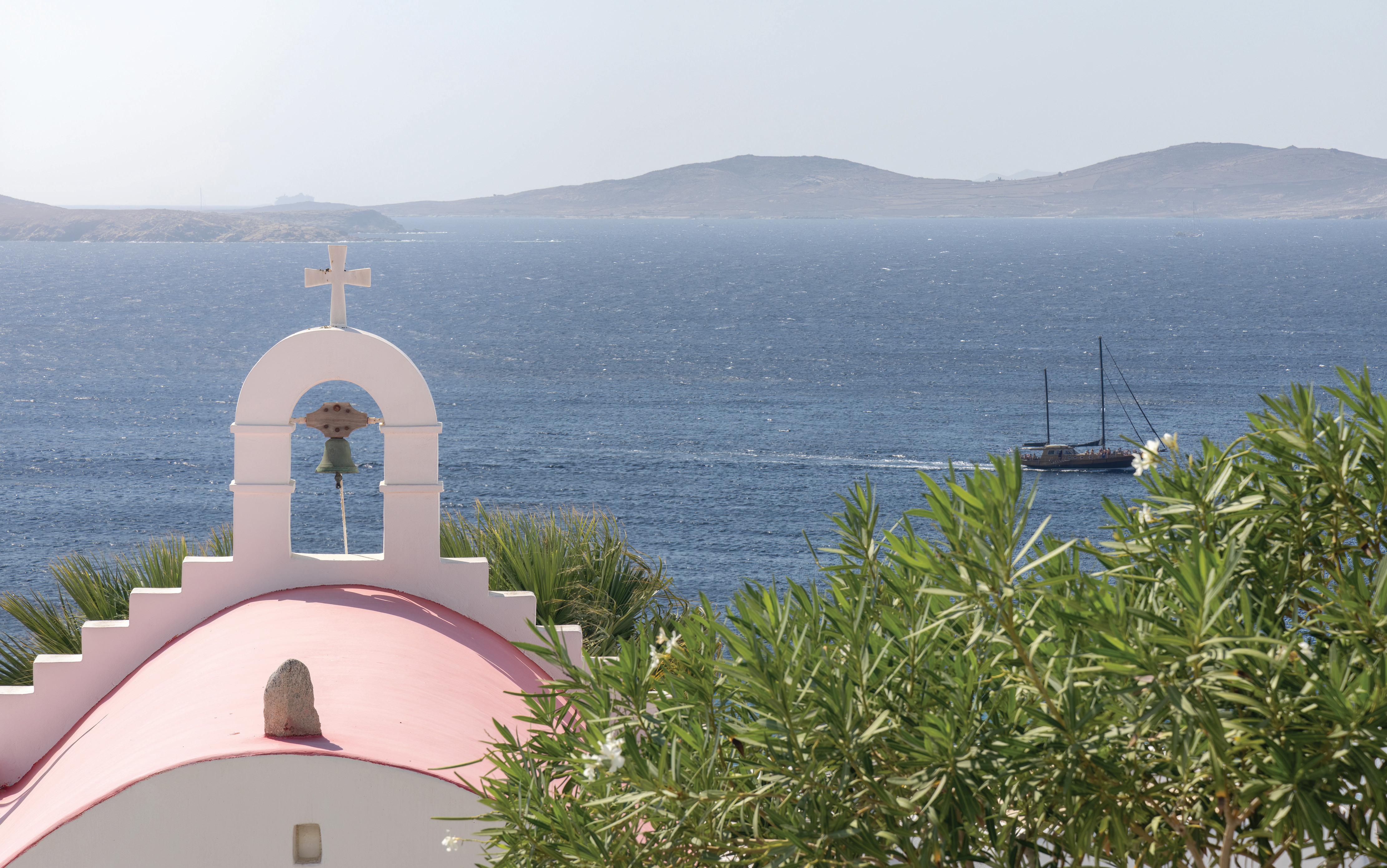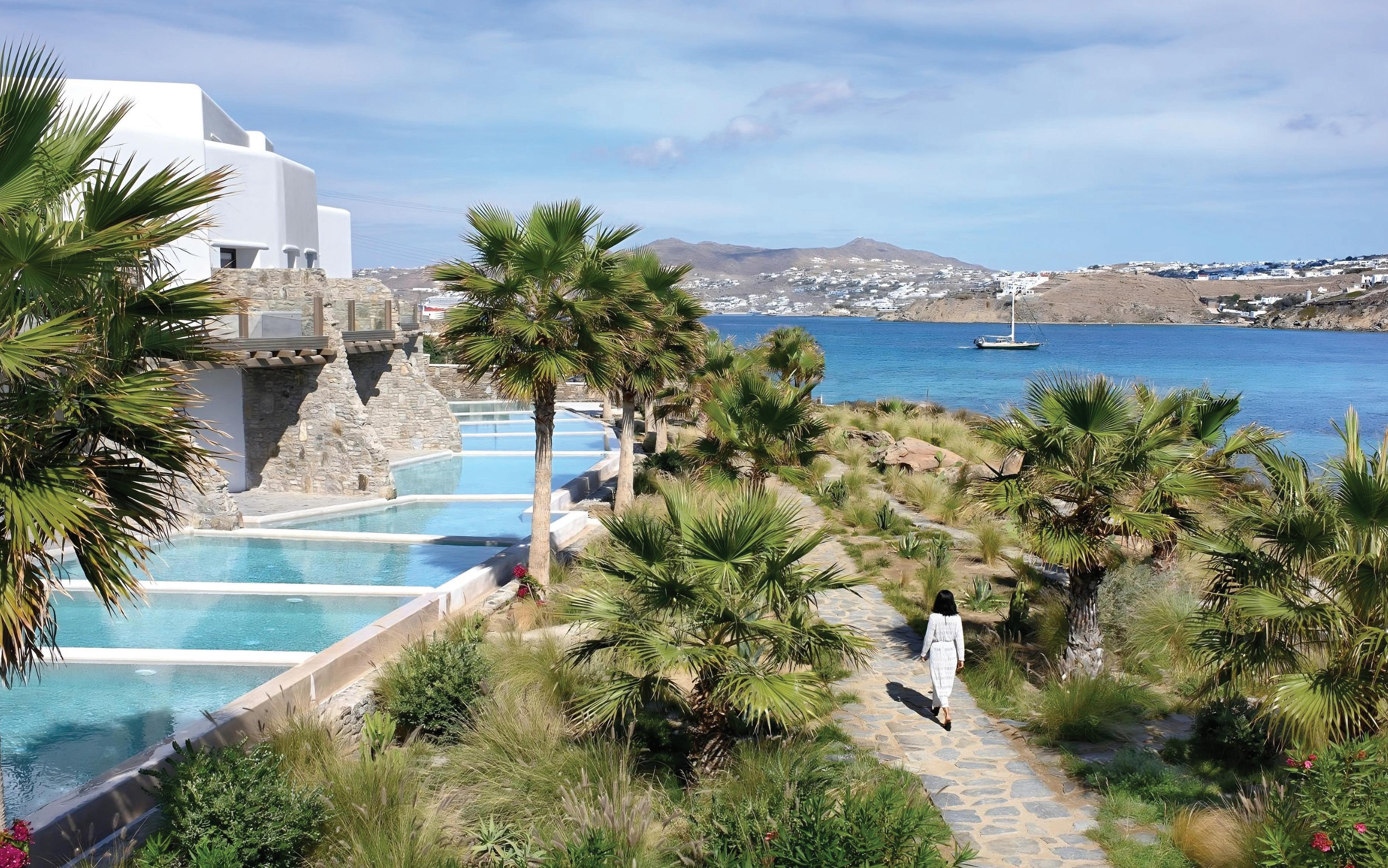 Of the 6,000 islands and islets rising from the Greek Seas — only 227 of which are inhabited — the allure of Mykonos has continuously ourished since it rst trended with travelers in the early 1960s. Mykonos’ geometric, whitewashed facades against the deep blues of the waters surrounding ancient islands like Delos are charming, yet as the island’s built up, few uninterrupted stretches of coastal views remain.