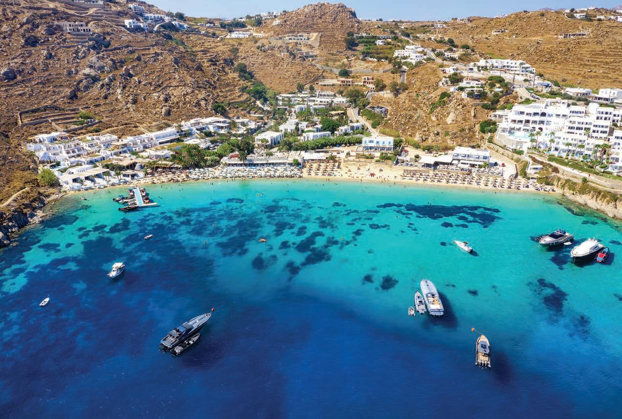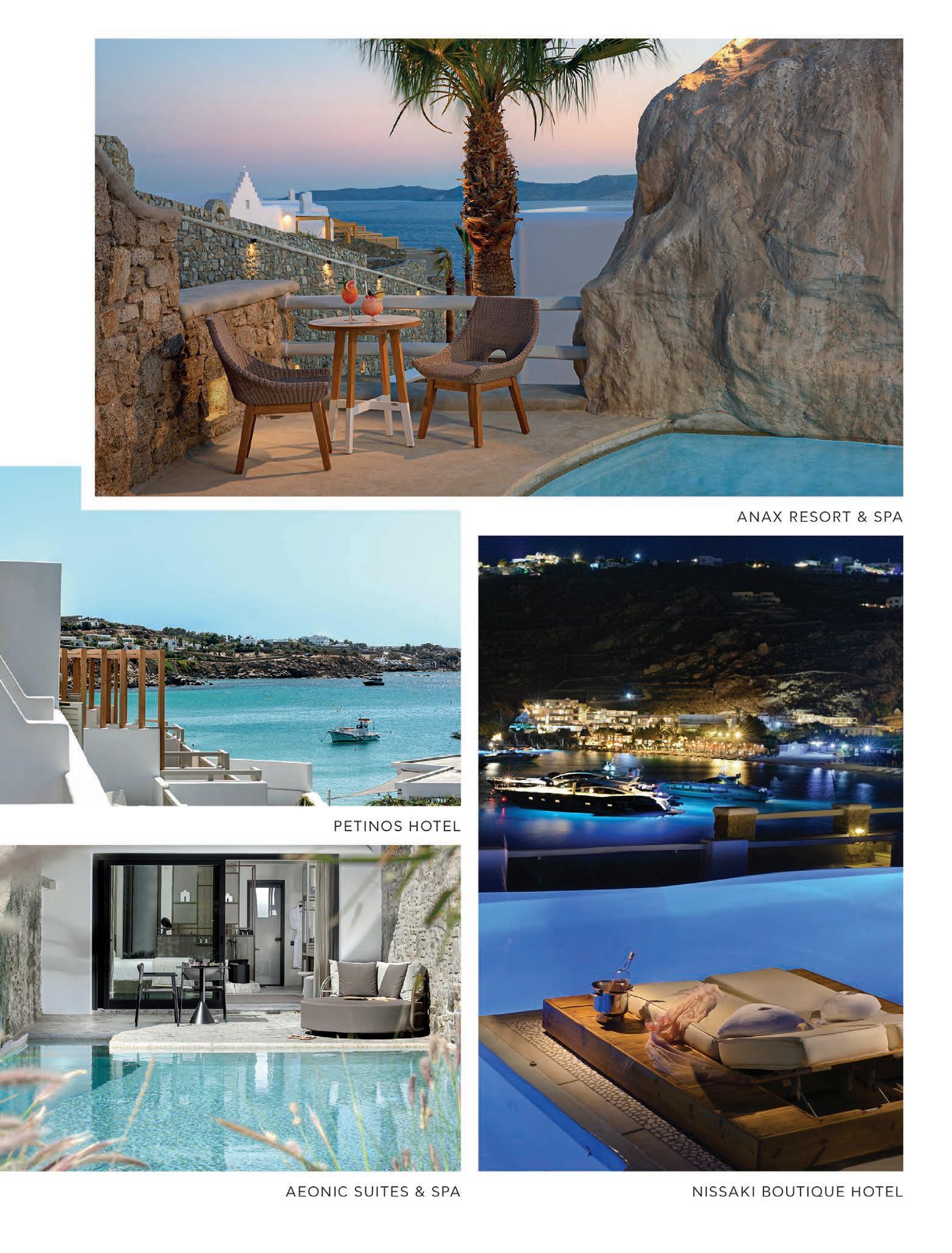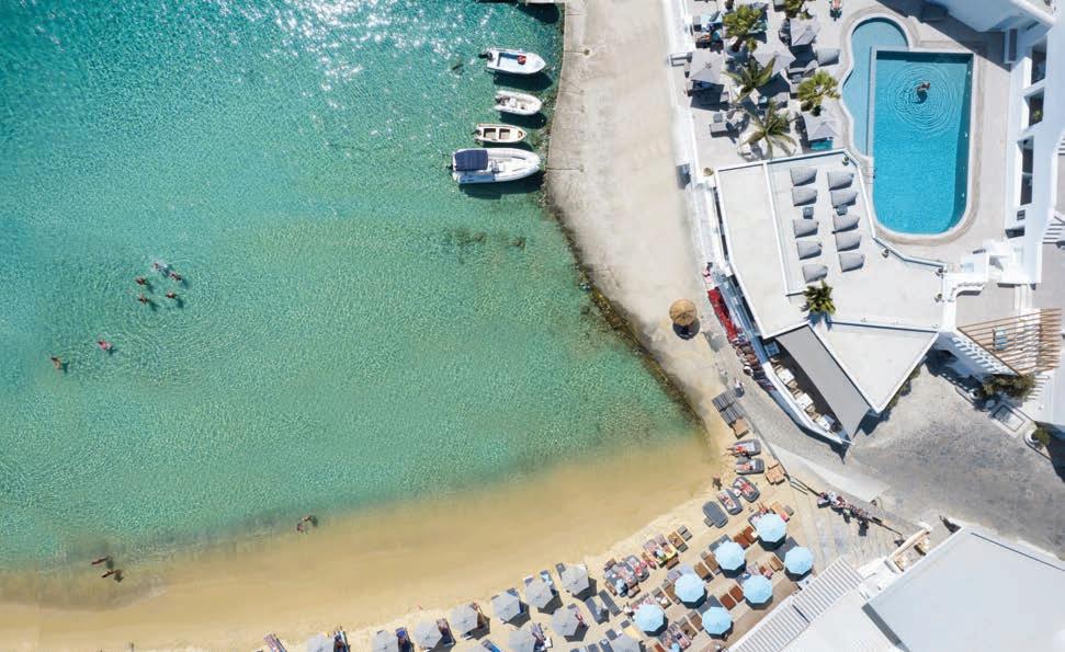 White sandy beaches along azure coastlines stretch as far as the eye can see, o ering a haven for sunseekers and water enthusiasts alike. Award-winning restaurants tantalize taste buds with their culinary prowess, while legendary parties pulse with an energy that is simply infectious. Luxury yachts dot the turquoise waters, complemented by dreamy resorts that seem to belong to another realm altogether. e quintessential jet-setter of the Cyclades, Mykonos beckons travelers with its palpable energy, pristine beaches, tantalizing cuisine, and vibrant nightlife. And since 2003, Petinos’ Resorts Of Mykonos has pampered guests with ve-star service, ensuring that every whim is catered to with the utmost care and attention. It’s a world where indulgence and adventure intertwine seamlessly, inviting you to immerse yourself in the cosmopolitan charm of the Greek islands.